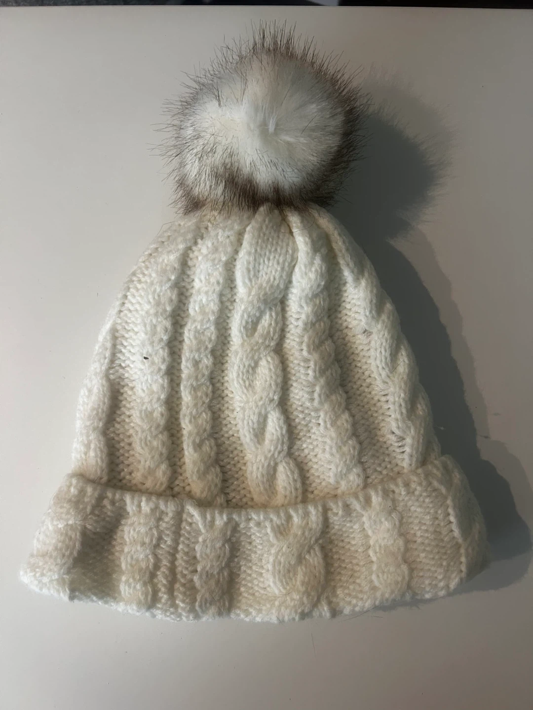 A cozy white cable knit toque with a faux fur pom pom. It's made from a soft, warm material perfect for chilly weather. This hat features a classic cuffed brim design.
