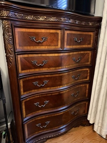 The Chestnut Brown Dresser is a stylish and functional piece of furniture for any bedroom. Made from durable wood, this dresser features five spacious drawers with brass handles for easy access. The chestnut brown color adds a touch of warmth to the room, while the sleek design and dimensions of 55 inches in height, 42 inches in length, and 20 inches in width make it ideal for holding a TV up to 50 inches. Perfect for organizing clothing and accessories, this dresser is a practical addition to any bedroom space.