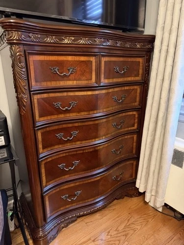 The Chestnut Brown Dresser is a stylish and functional piece of furniture for any bedroom. Made from durable wood, this dresser features five spacious drawers with brass handles for easy access. The chestnut brown color adds a touch of warmth to the room, while the sleek design and dimensions of 55 inches in height, 42 inches in length, and 20 inches in width make it ideal for holding a TV up to 50 inches. Perfect for organizing clothing and accessories, this dresser is a practical addition to any bedroom space.