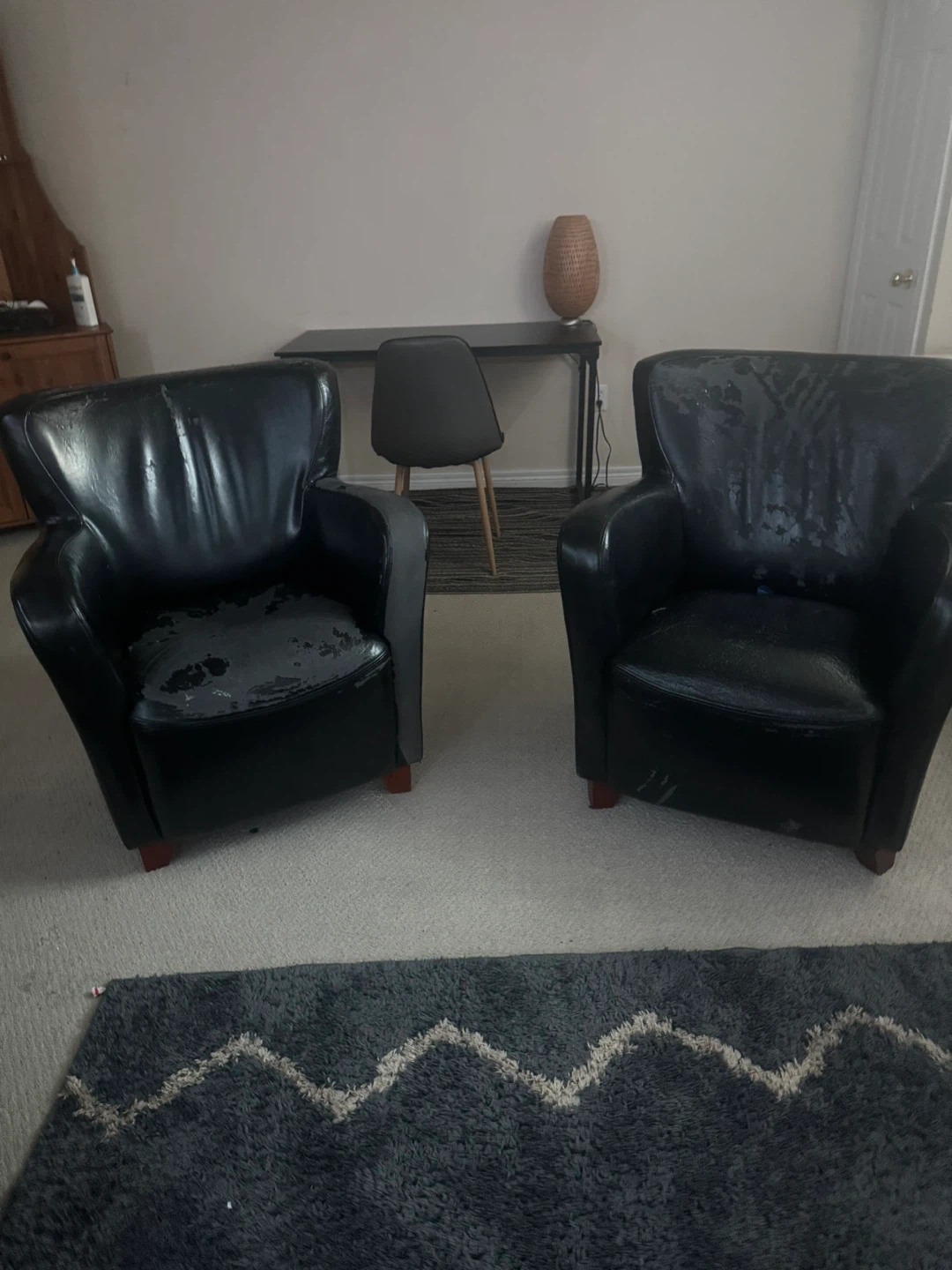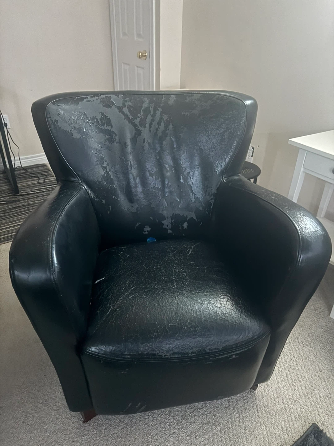 Selling a black leather armchair. It shows signs of wear, as seen in the photos. Still a sturdy piece of furniture if you're looking for something functional!
