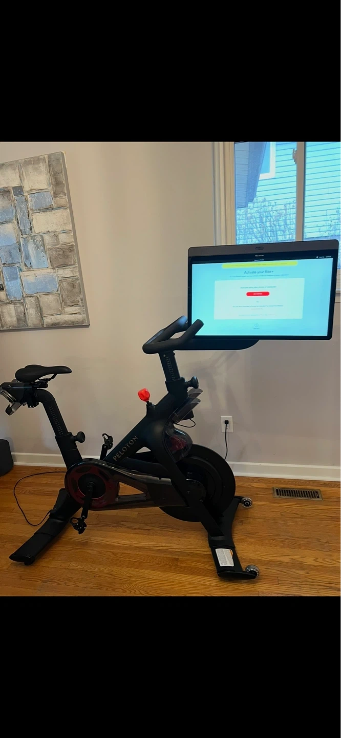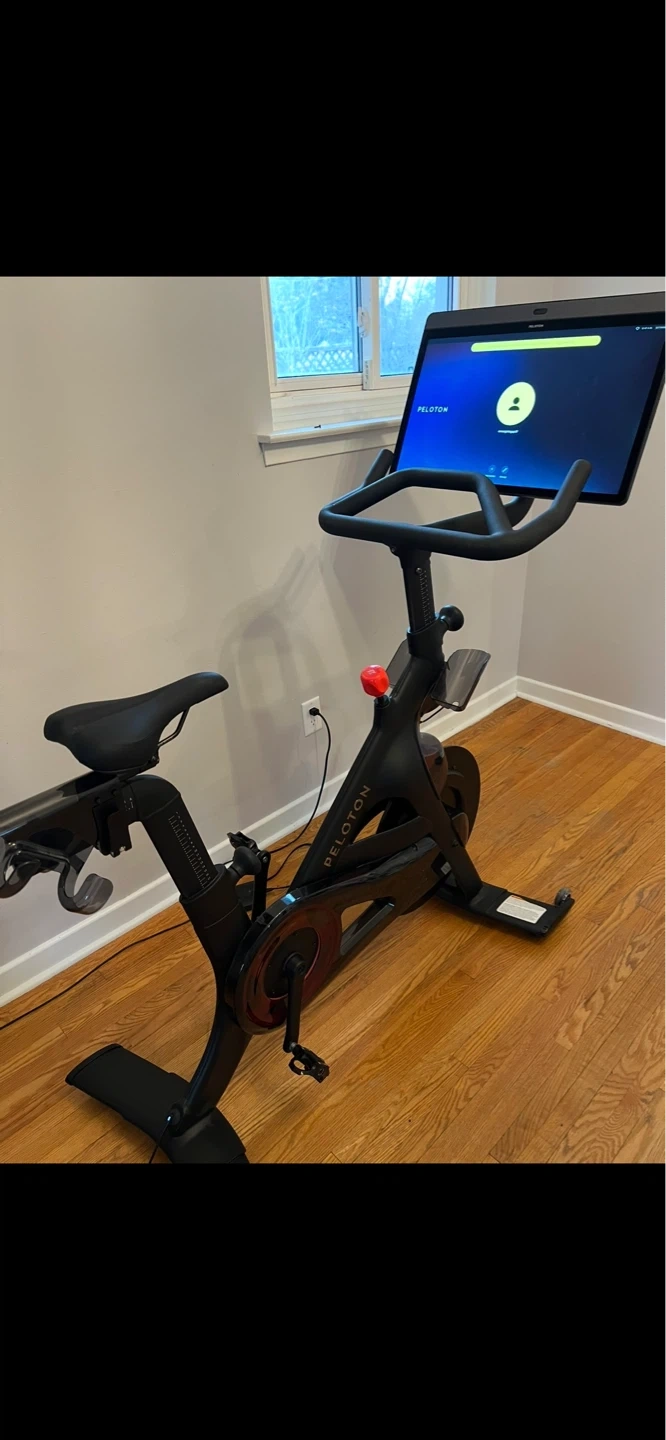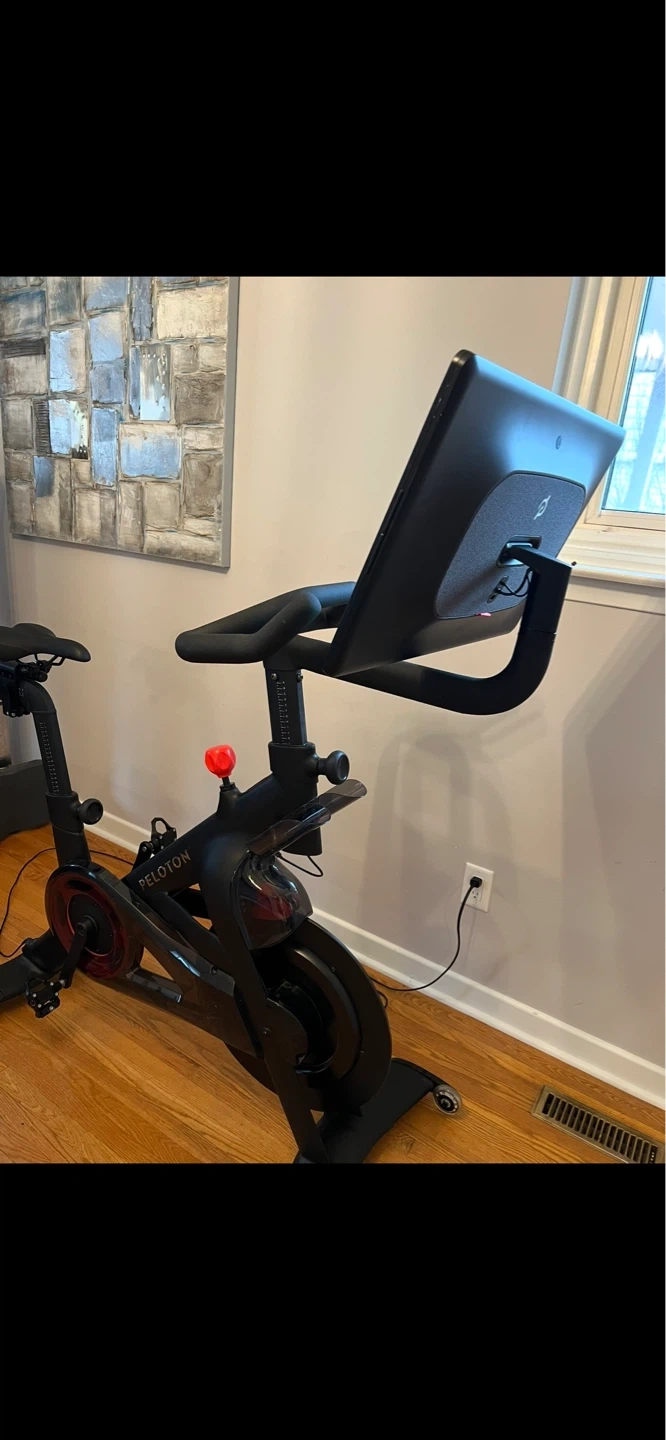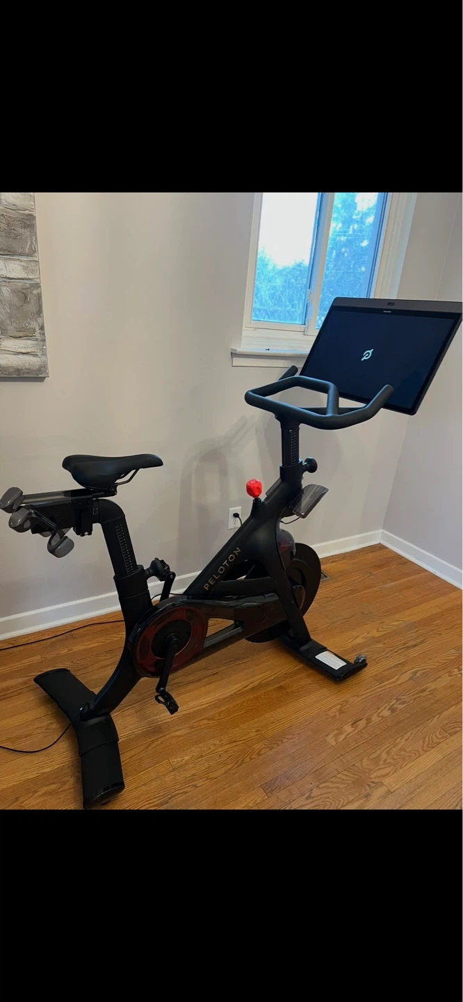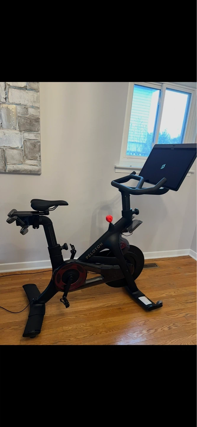 Peloton stationary bike with integrated screen. Fully functional and ready for your workouts! Adjustable seat and handlebars for personalized comfort. Pick up in Burlington or I can deliver it