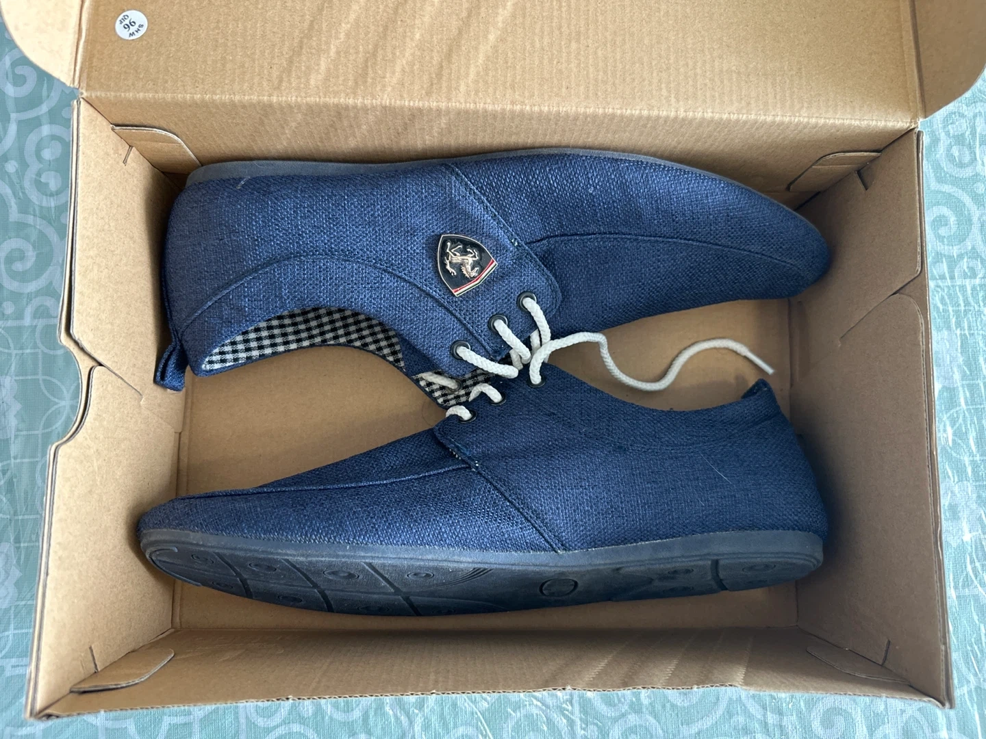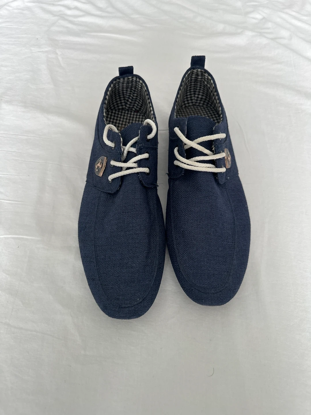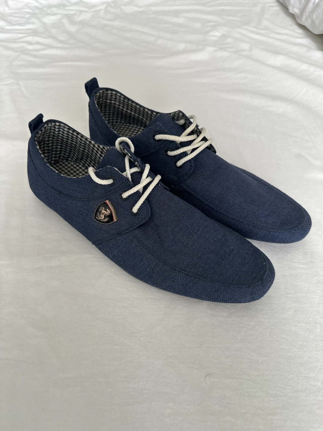 These men's unused casual shoes are a deep navy blue colour. They feature white laces and a subtle emblem on the side. The interior lining has a checkered pattern. Size is 9.