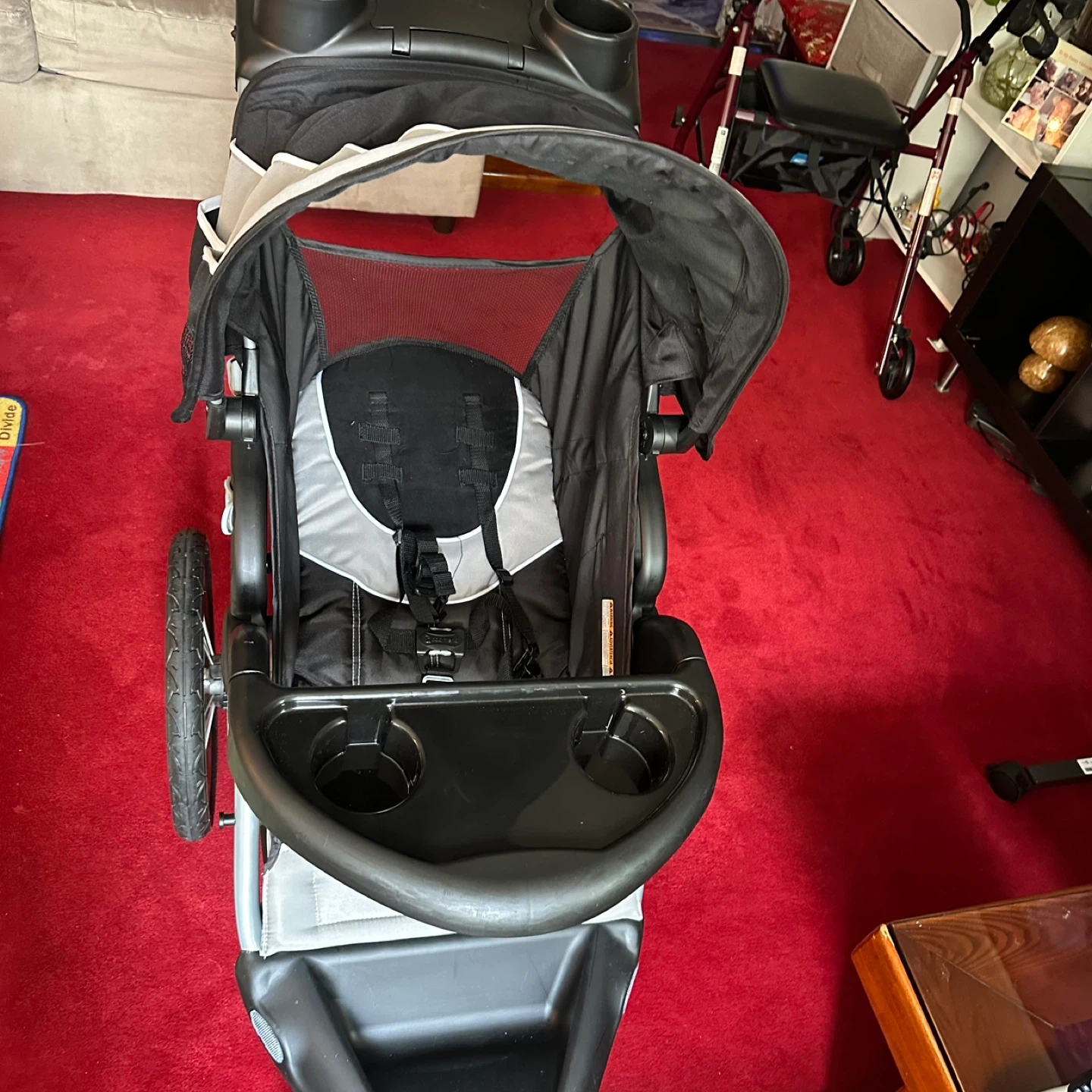 This Baby Trend Expedition stroller offers a smooth ride with large wheels. It's designed for jogging and features a comfortable seat and a convenient parent tray. The stroller also includes a large storage basket underneath.
