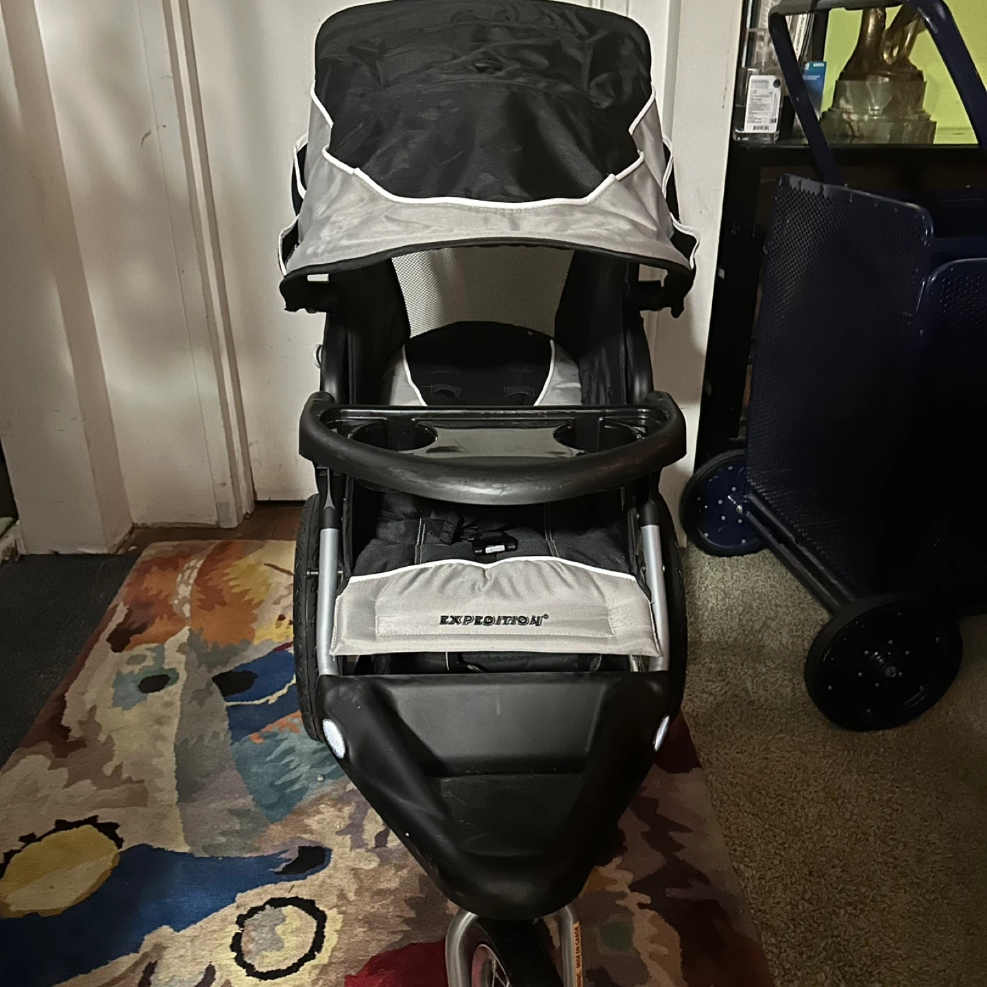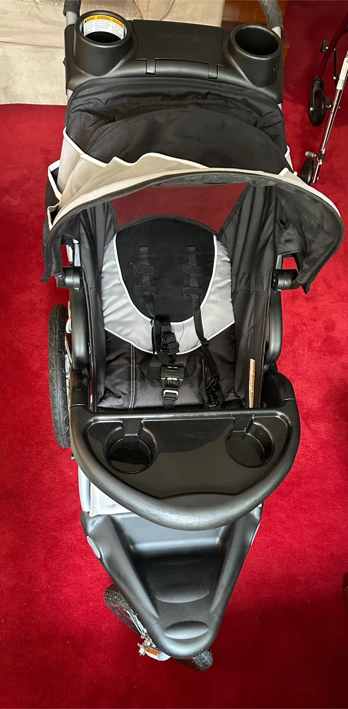 This Baby Trend Expedition stroller offers a smooth ride with large wheels. It's designed for jogging and features a comfortable seat and a convenient parent tray. The stroller also includes a large storage basket underneath.
