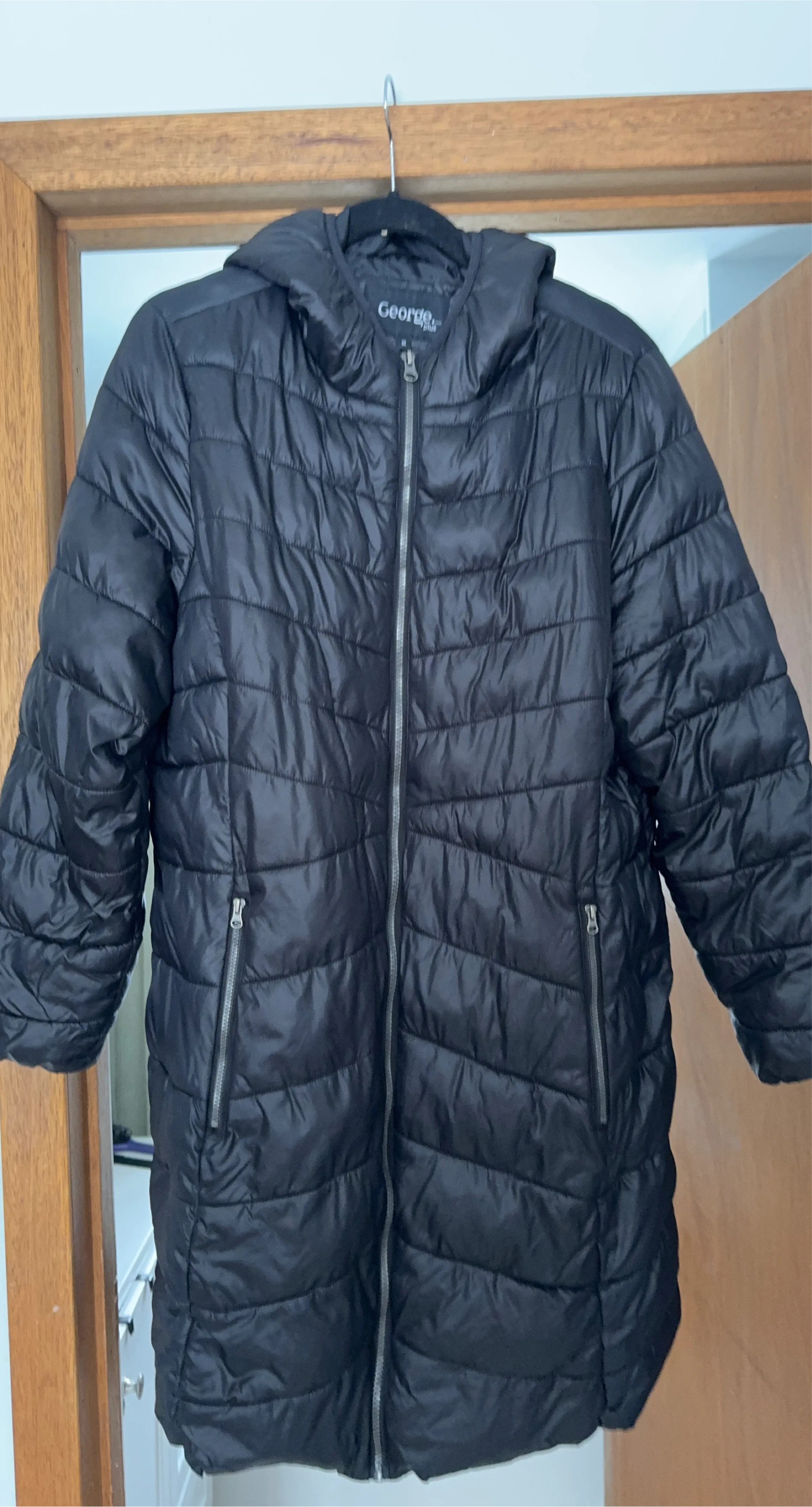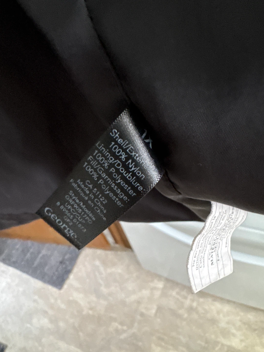 This George puffer jacket is black and size XL. It's made with a 100% nylon shell and 100% polyester fill. It's a great jacket for keeping warm on cooler days!