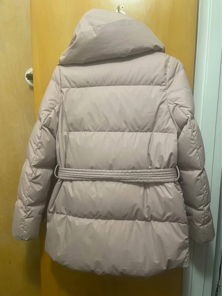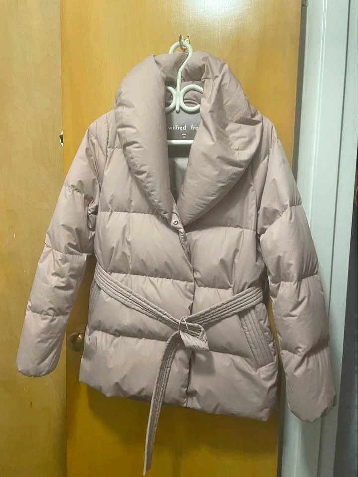 Stylish Wilfred Free Alta puffer jacket. Size XS in a pretty pink/blush color. Has a cozy large collar and a tie belt for a cinched look. Shell is 100% cotton, lining is 100% nylon. Filling has 90% goose down and 10% goose feathers. Super warm for chilly days.
