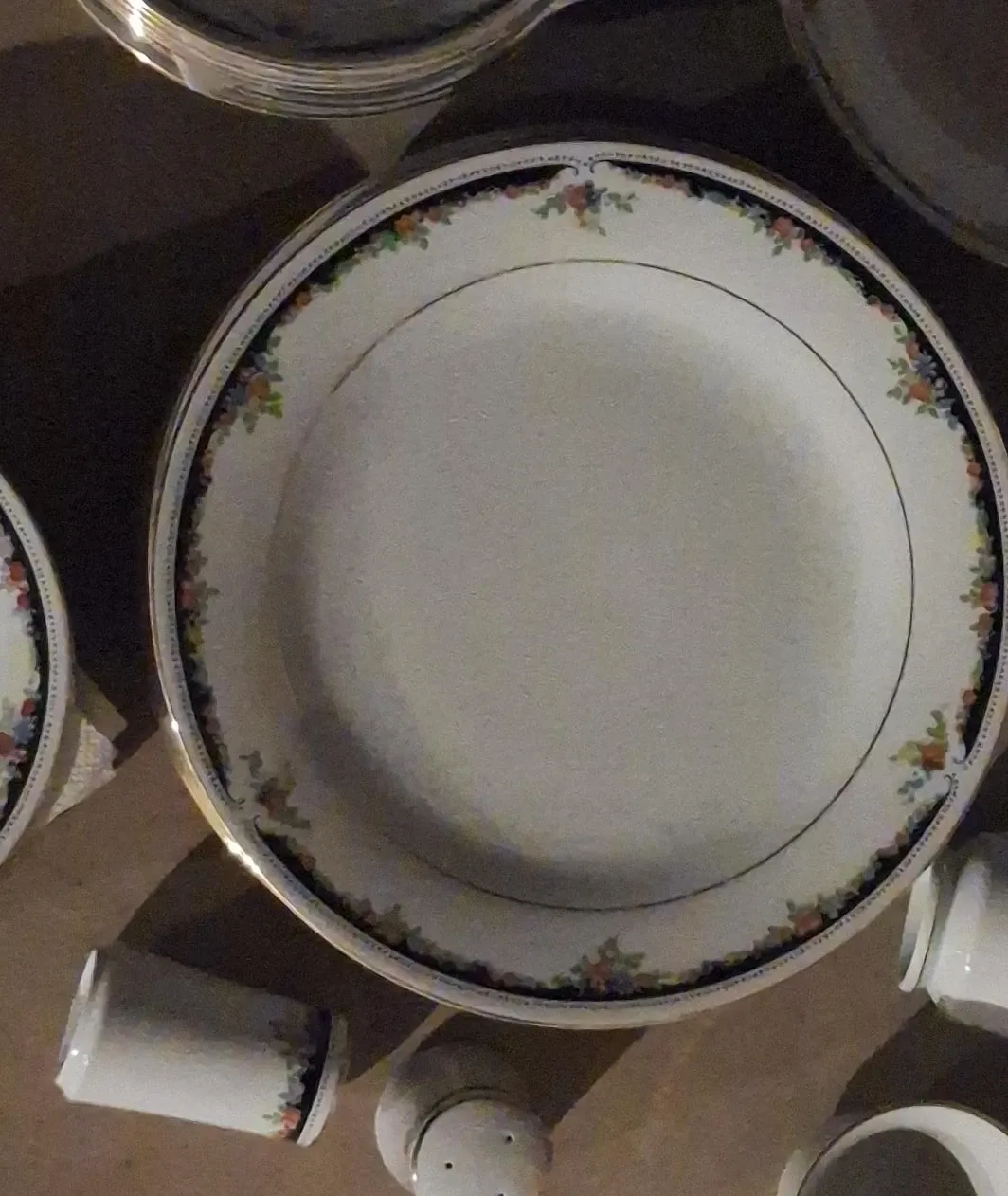 Set of white china dinner plates featuring a decorative floral border with blue and black accents. These plates have a classic design, perfect for everyday use or special occasion. Set of 8 place settings