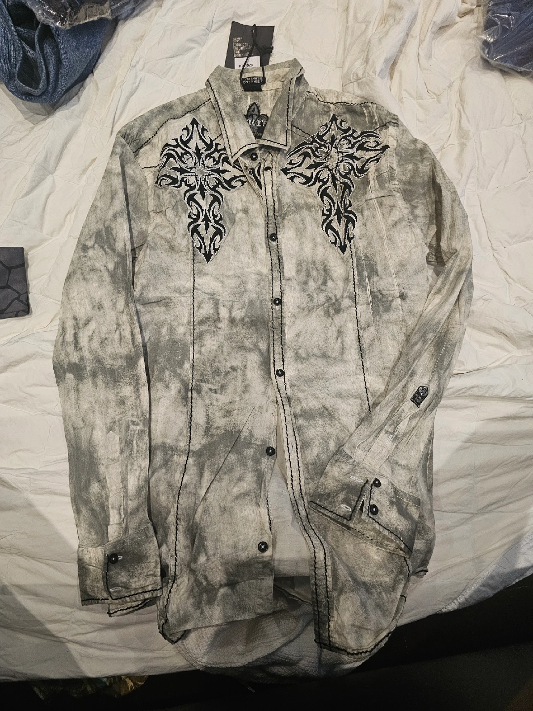 60Here's an Affliction button-down shirt in great condition! It features a unique design and is perfect for adding some edge to your wardrobe. Check out the photos for details!