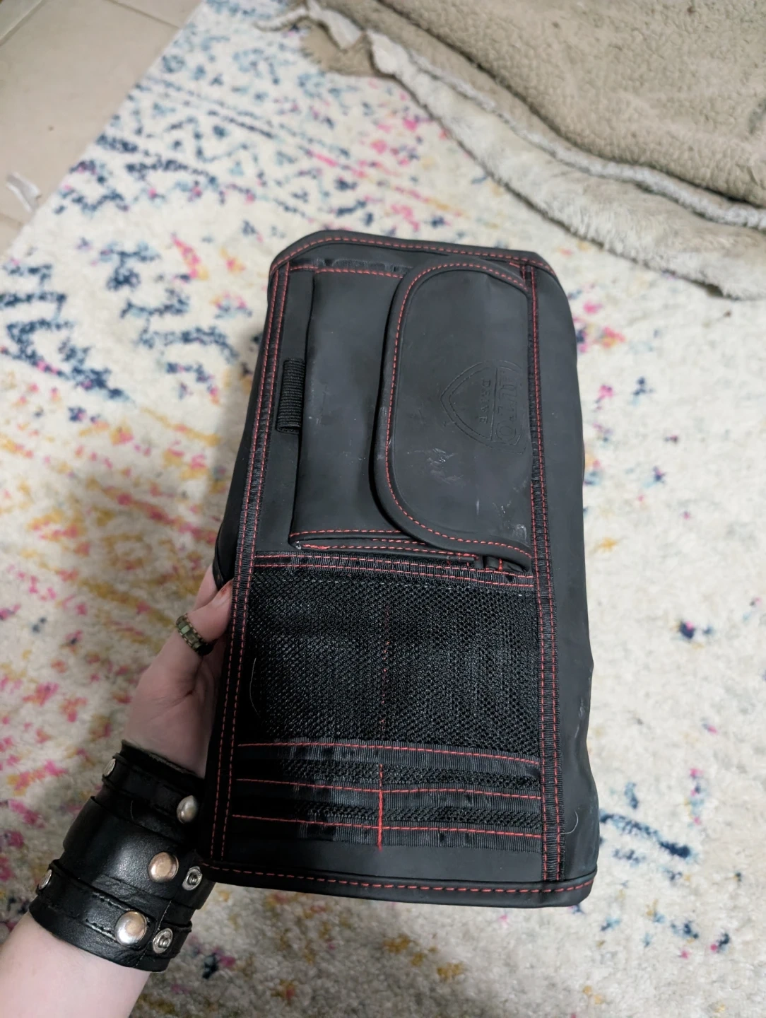 Storage case with red stitching details and multiple compartments. Attaches conveniently to car sun visor with included straps.