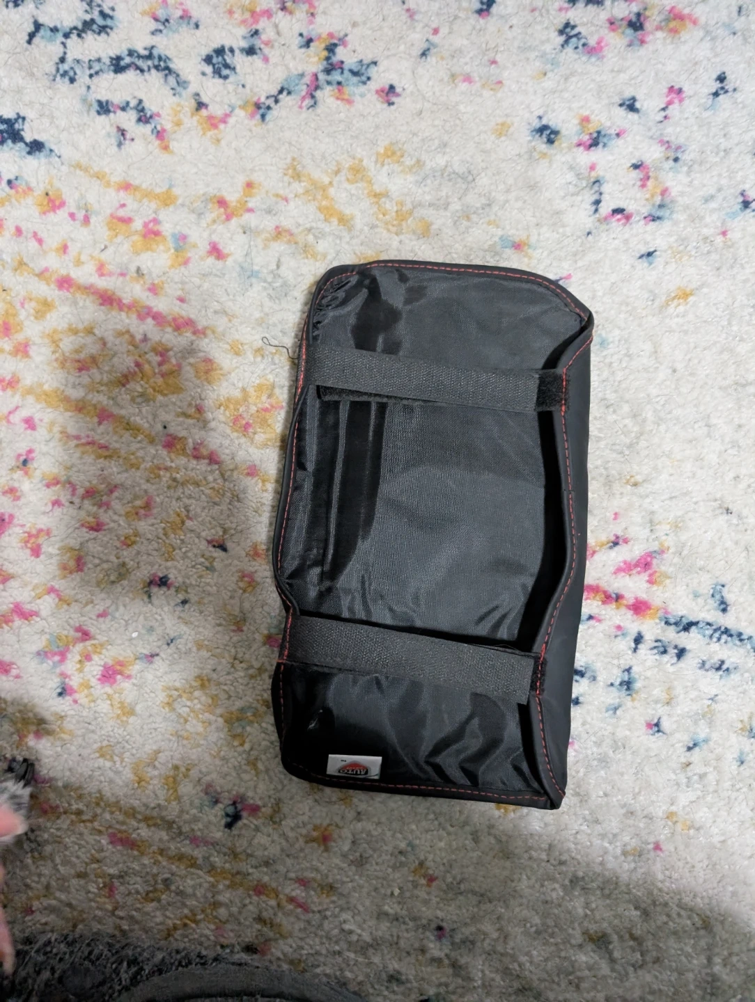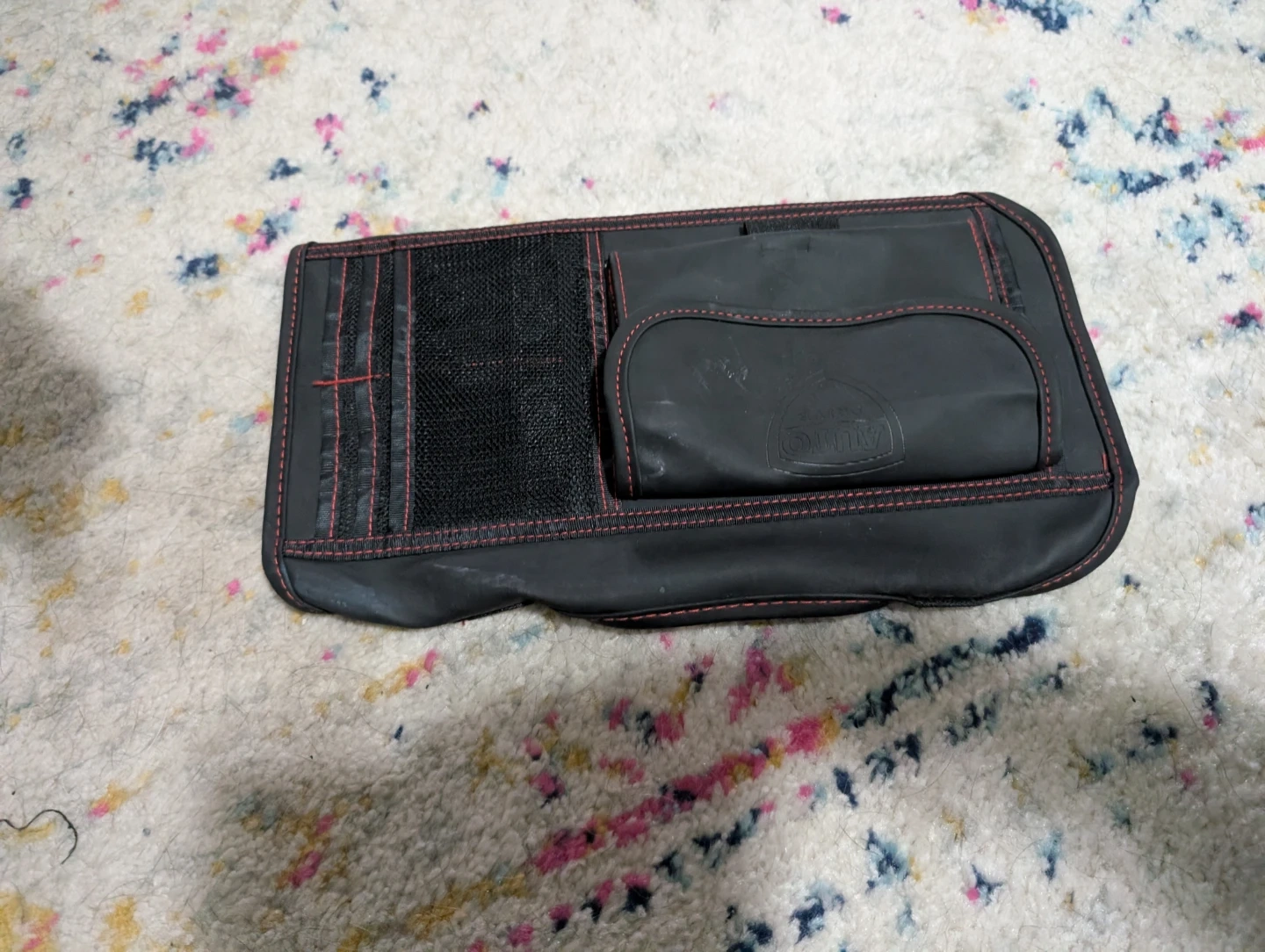 Storage case with red stitching details and multiple compartments. Attaches conveniently to car sun visor with included straps.
