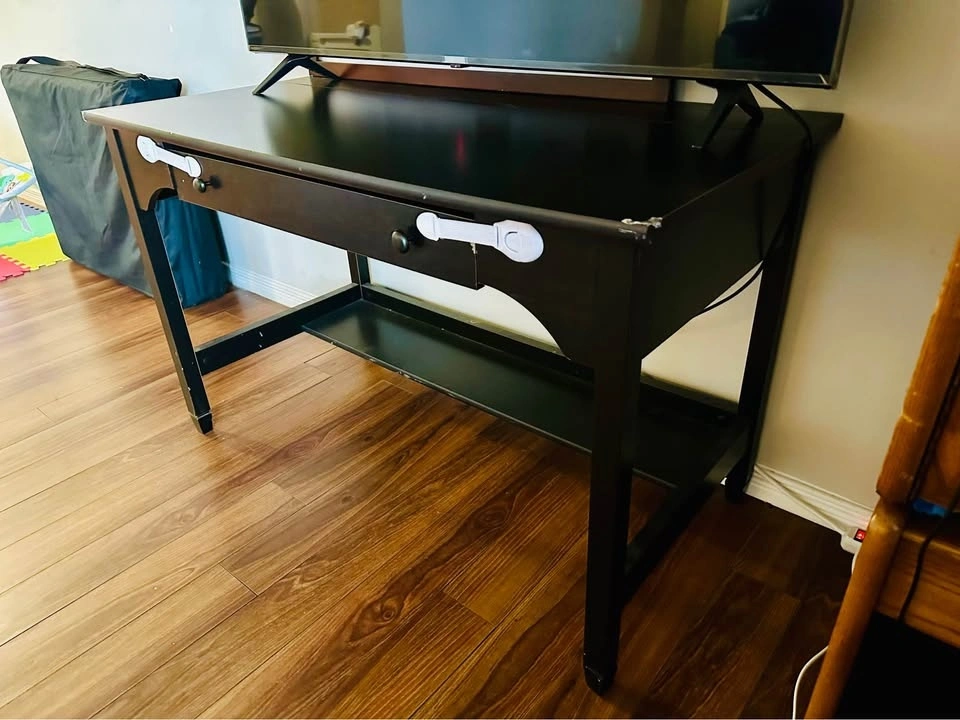 TV Table with drawer and hidden compartment at the back. Can accommodate up to 55” TV. The drawer needs to be tightened as shown in the picture and this reflects in the pricing. Only cash accepted.