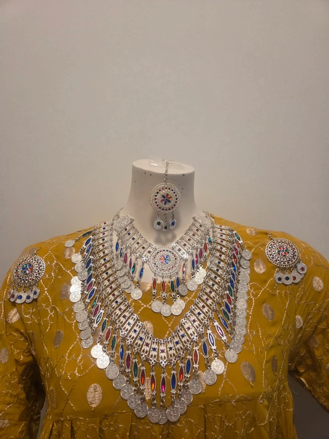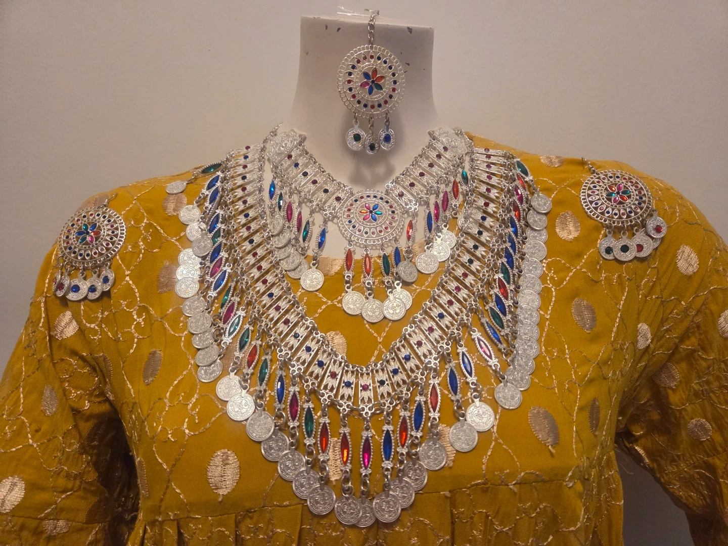 76Beautiful Afghani jewellery set, perfect for adding a touch of cultural elegance to any outfit! The set includes a necklace, earrings, and a headpiece, all adorned with colourful stones and intricate silver detailing