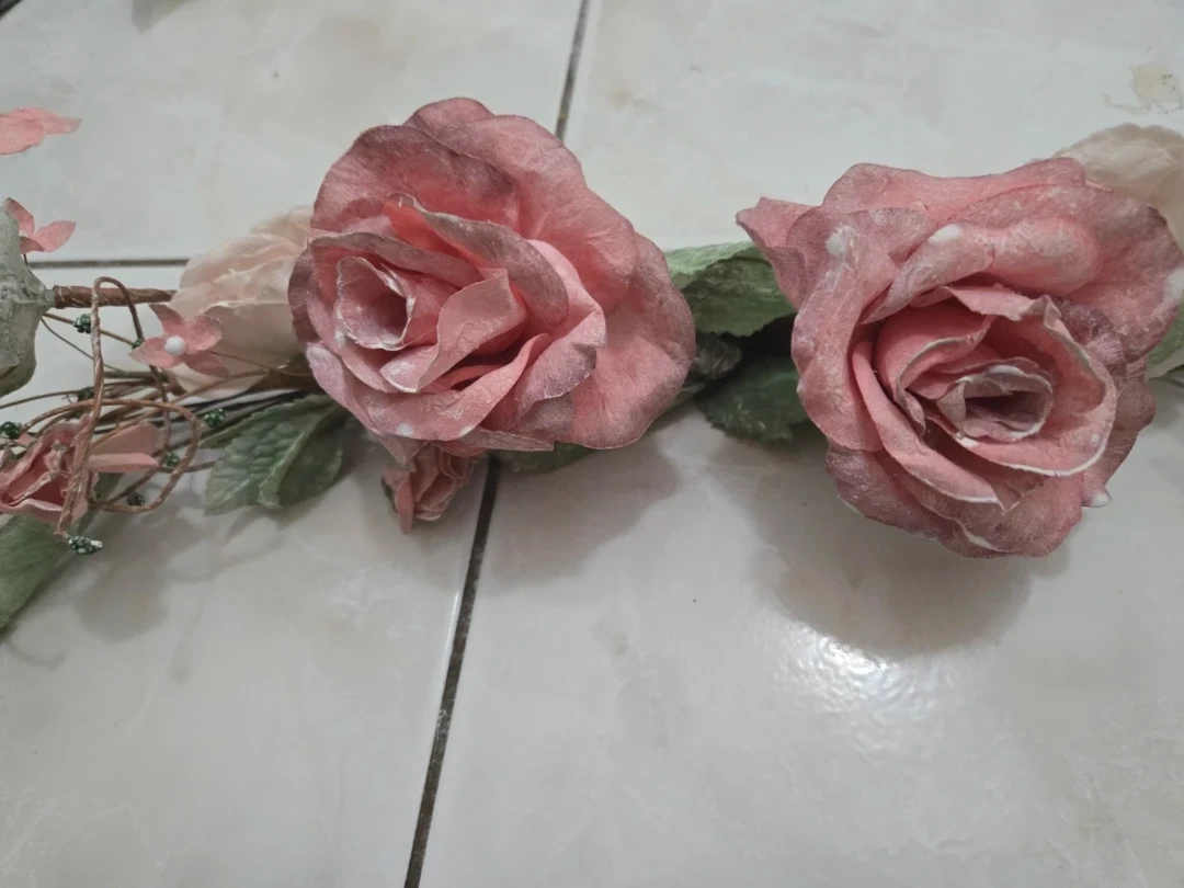 This garland features artificial roses and greenery attached to a branch base. It's a decorative piece for adding a floral touch to your space. The roses are a soft pink colour.