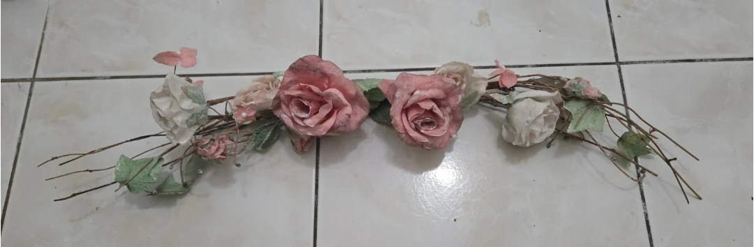 This garland features artificial roses and greenery attached to a branch base. It's a decorative piece for adding a floral touch to your space. The roses are a soft pink colour.
