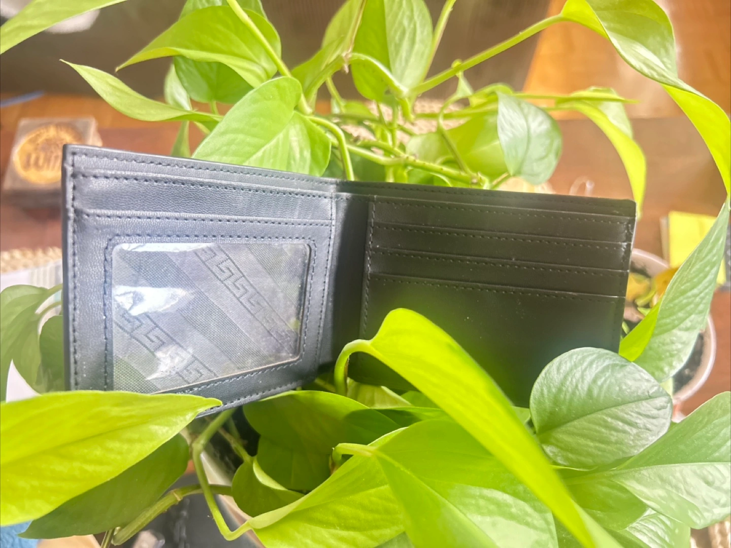 Selling a black wallet featuring a unique Indigenous design. It has slots for cards and a clear window for ID. A stylish and functional accessory!