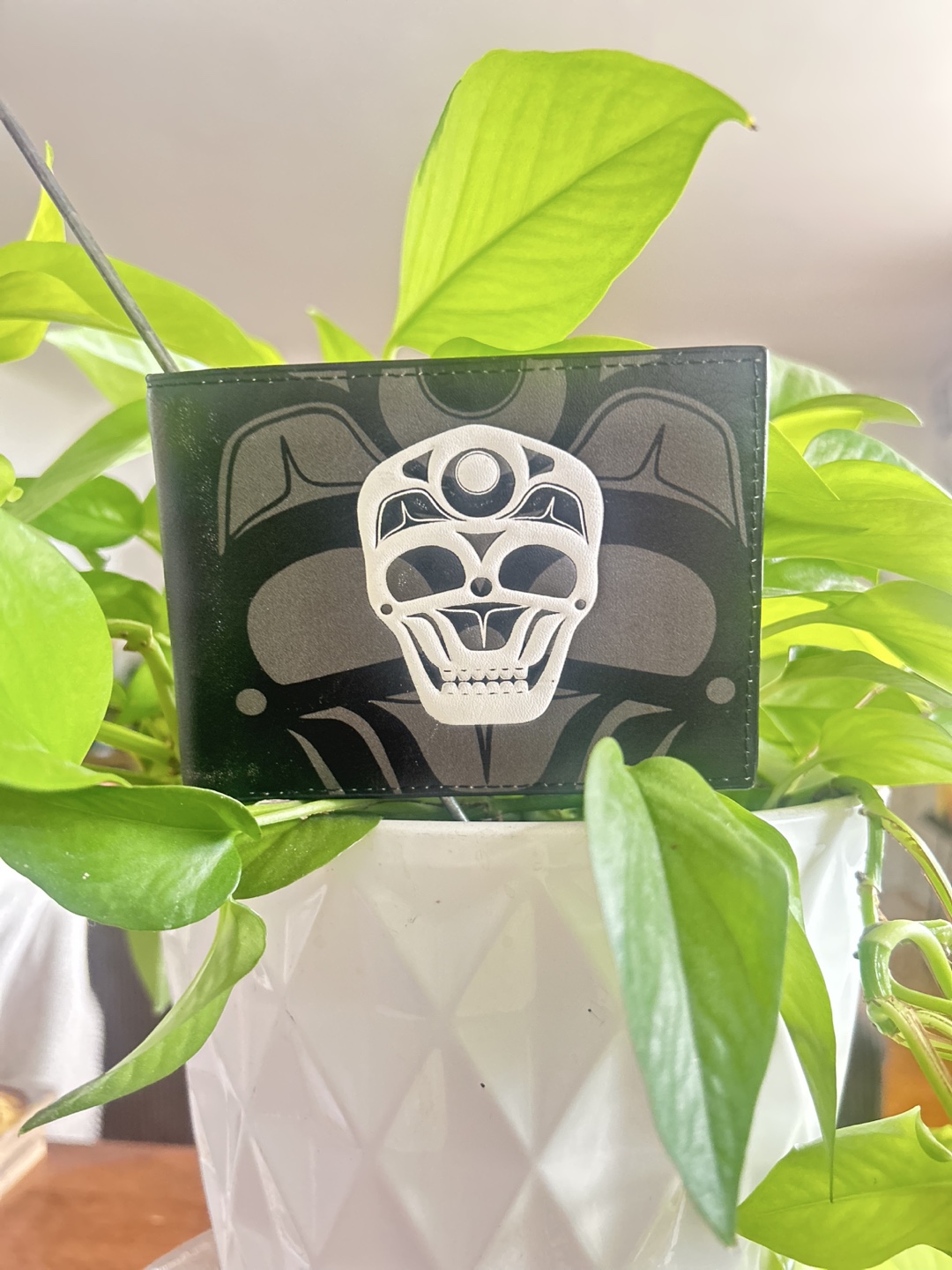 Selling a black wallet featuring a unique Indigenous design. It has slots for cards and a clear window for ID. A stylish and functional accessory!