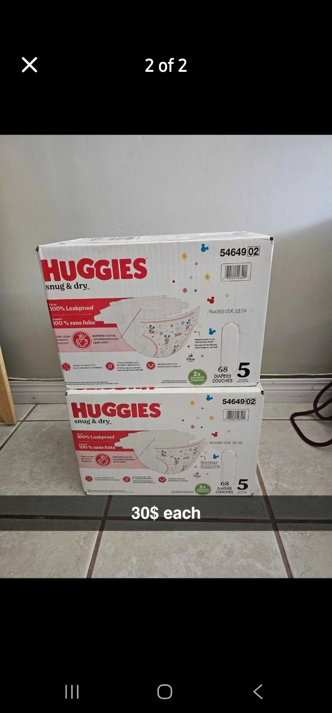 Two boxes of Huggies Snug & Dry diapers, size 5. Each box contains 68 diapers for a total of 136 diapers. They're 100% leakproof and made with 2x comfort! This is a great value for stocking up.