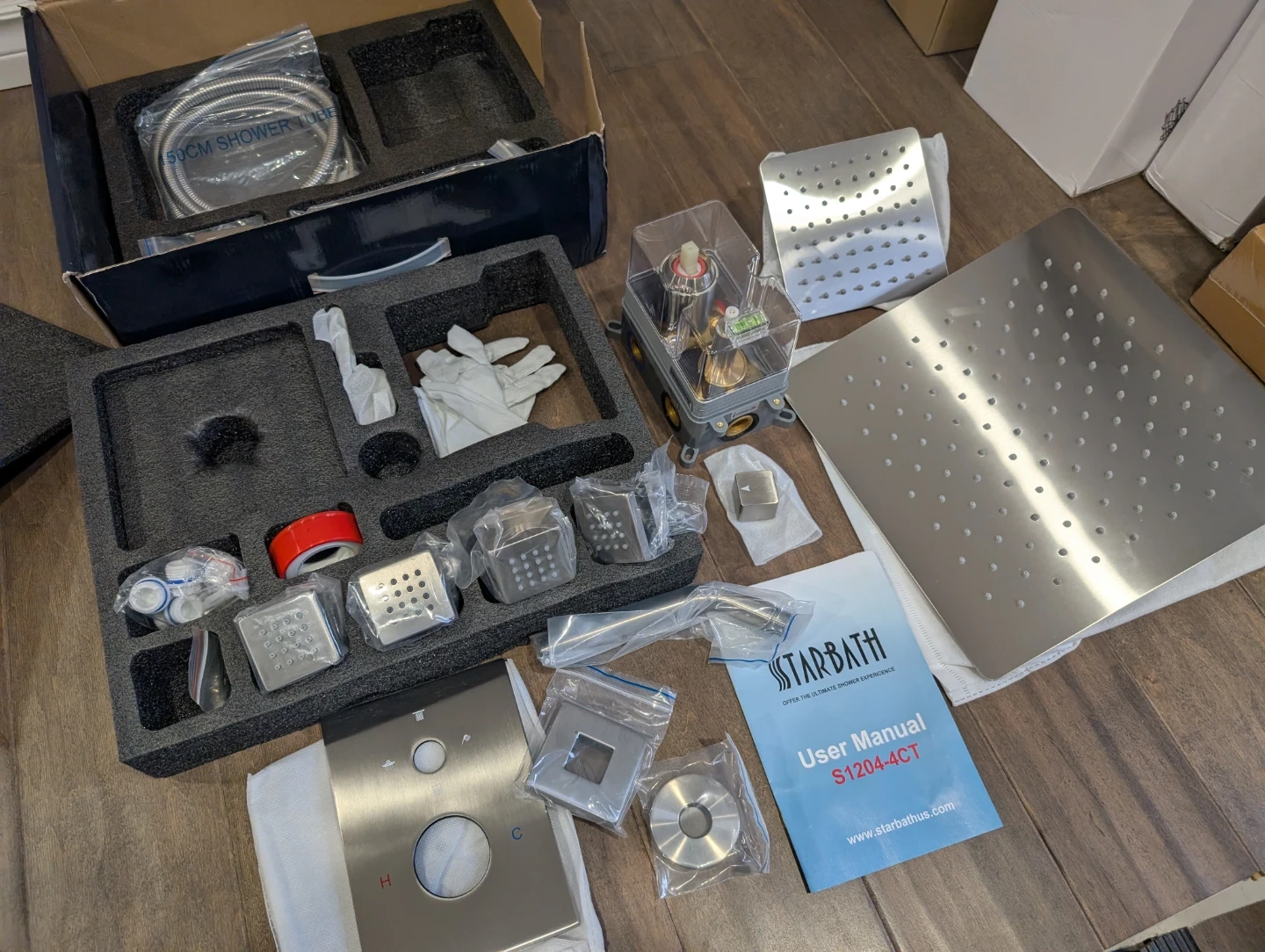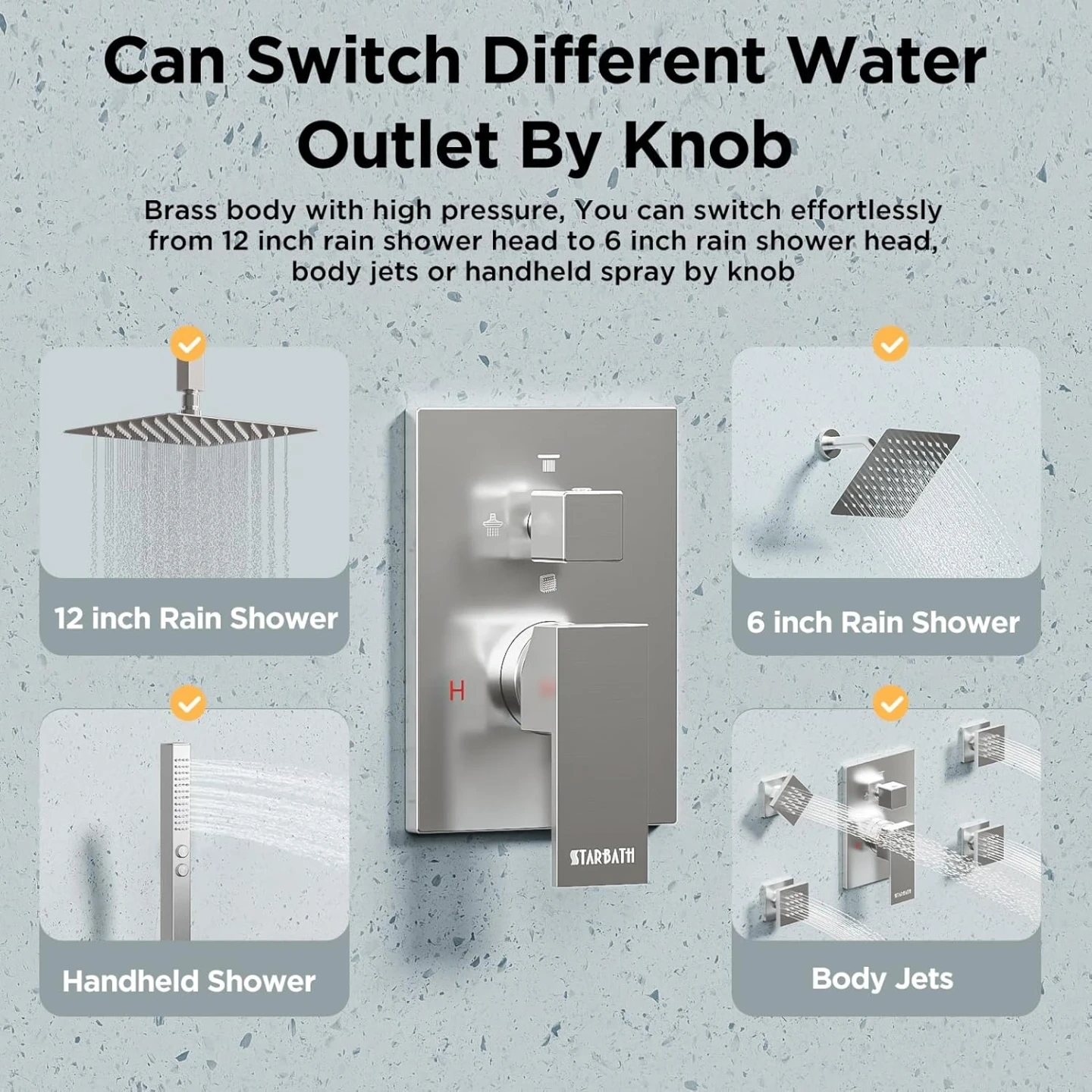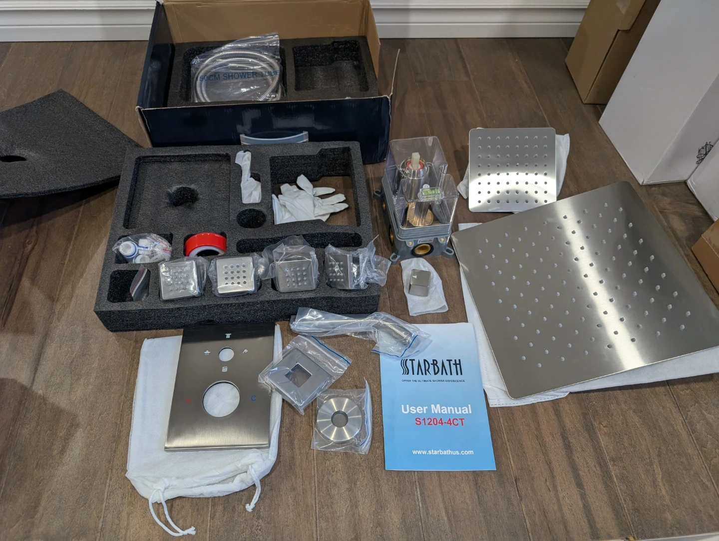 Brand new Starbath brushed nickel square 4 way shower head faucet kit for sale. 12” and 6” inch rainfall high pressure showerheads, shower head arm, pressure balanced valve cartridge, handle trim kit, hand shower wand with hose, 4 body spray jets, full kit with everything needed, $240 FIRM.