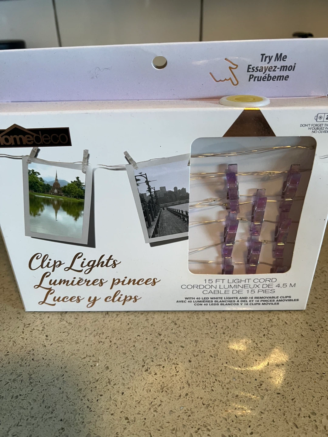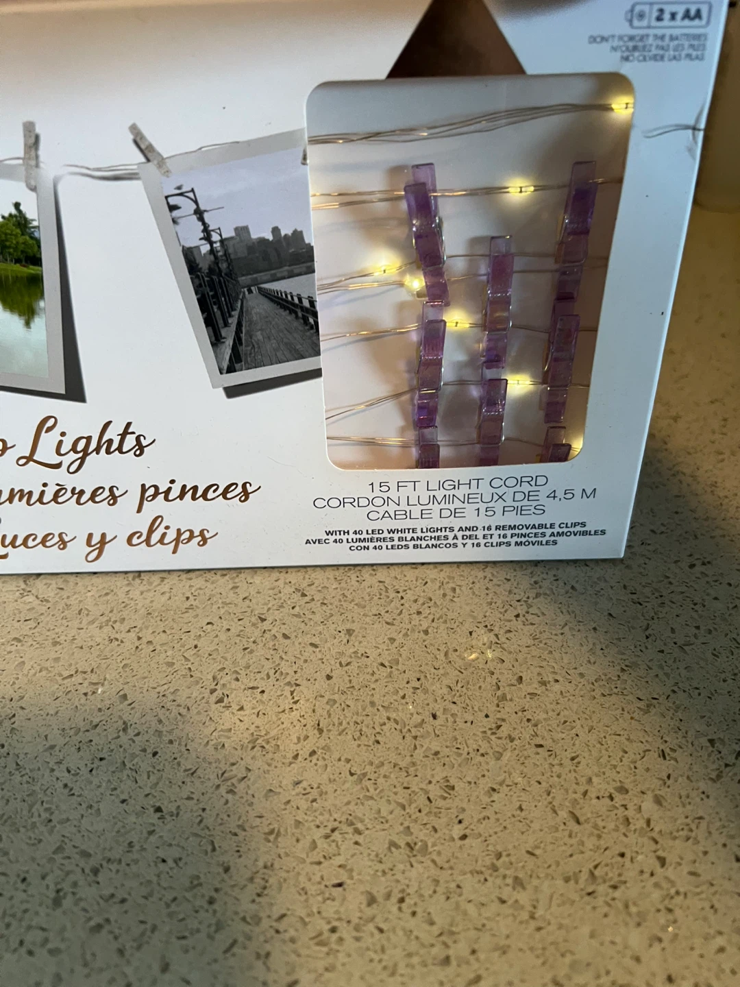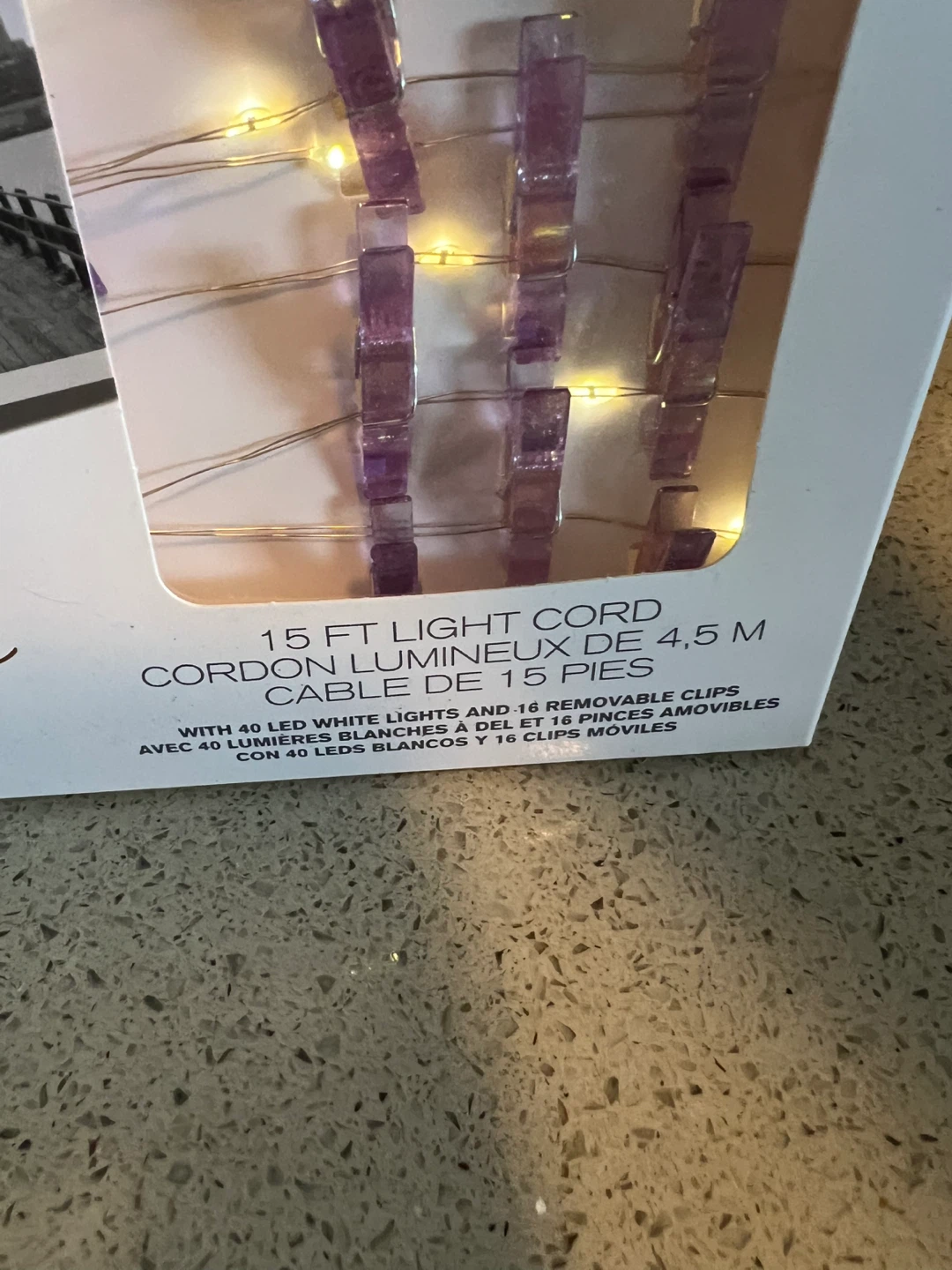 These clip lights come with 40 white LED lights and 16 removable clips. The light cord is 15 ft long. They're great for displaying photos or other mementos!