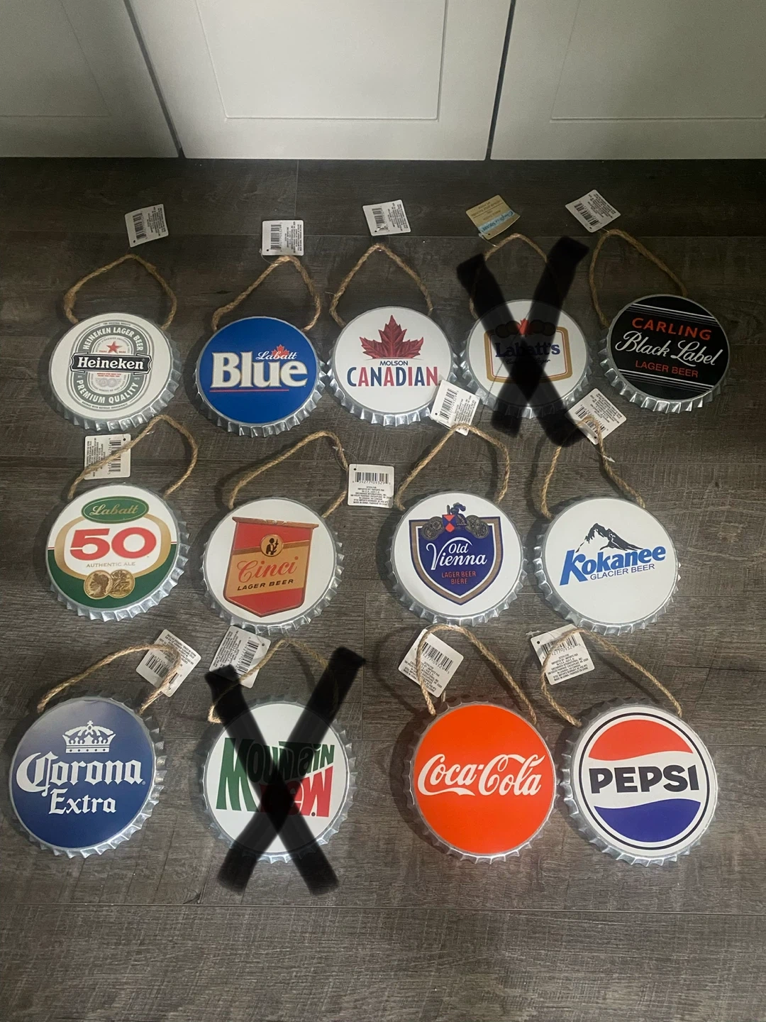 Add a retro touch to your space with these fun bottle cap wall decor pieces! Available in a variety of brands including Coca-Cola, Pepsi, Corona, and more. They're brand new and ready to hang! 5.5 inches diameter . 12 each OR 2 for 20$