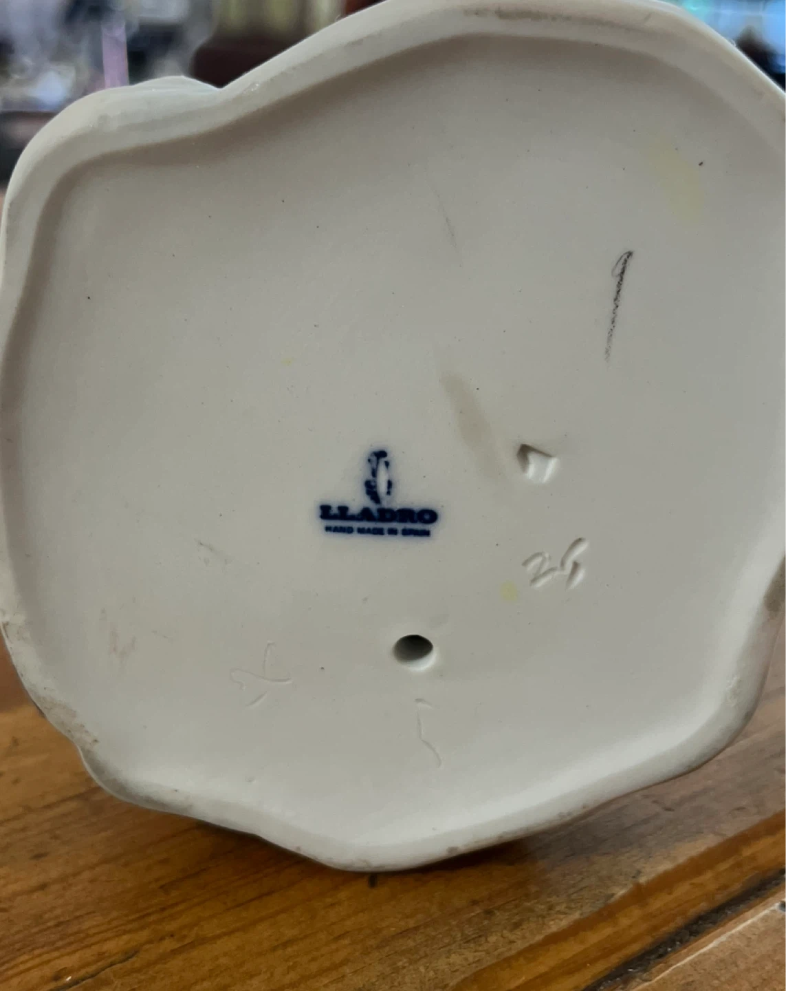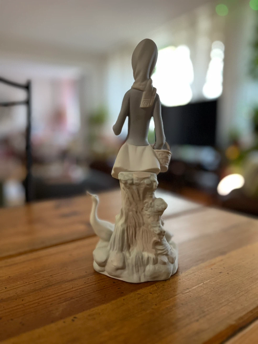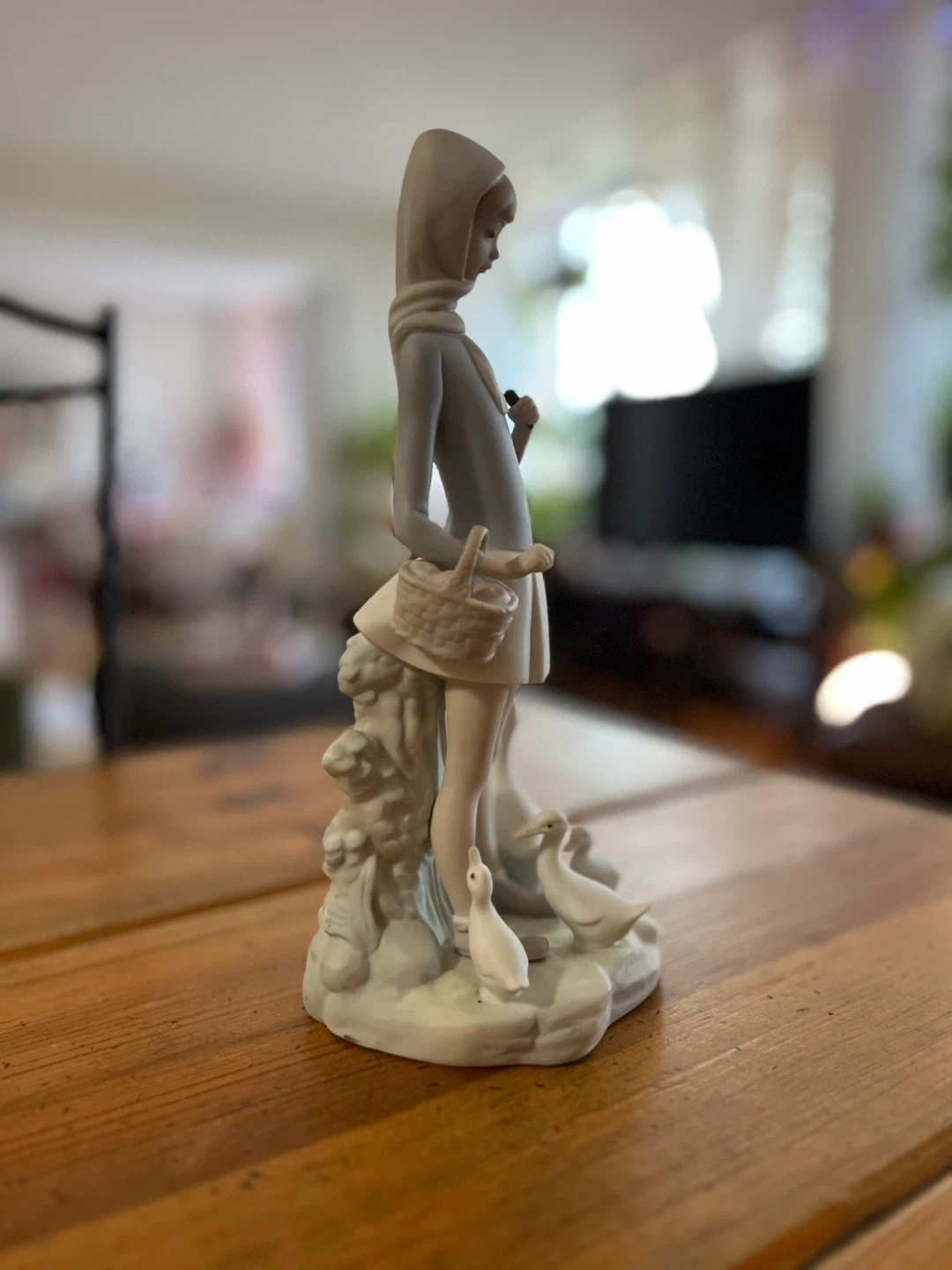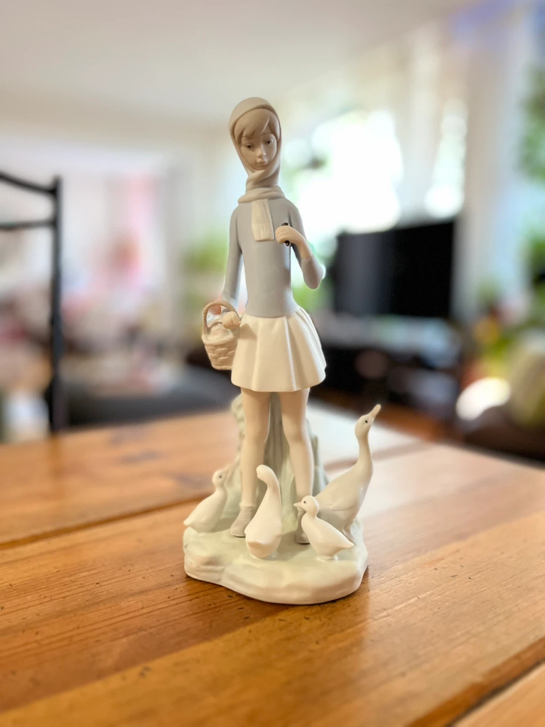 Young Girl with a basket tending to her geese is this "LLADRO GIRL WITH UMBRELLA & GEESE" FIGURINE