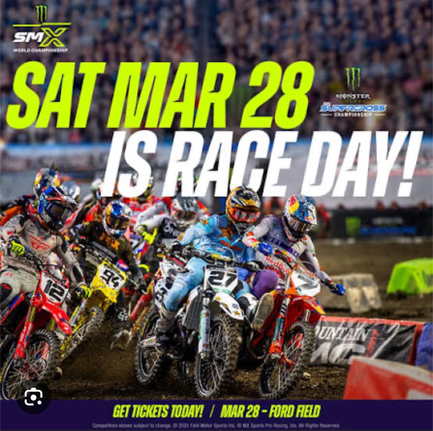 SMX World Championship and Monster Energy Supercross event scheduled for Saturday, March 28th at Ford Field. Get your tickets today for this exciting race day!