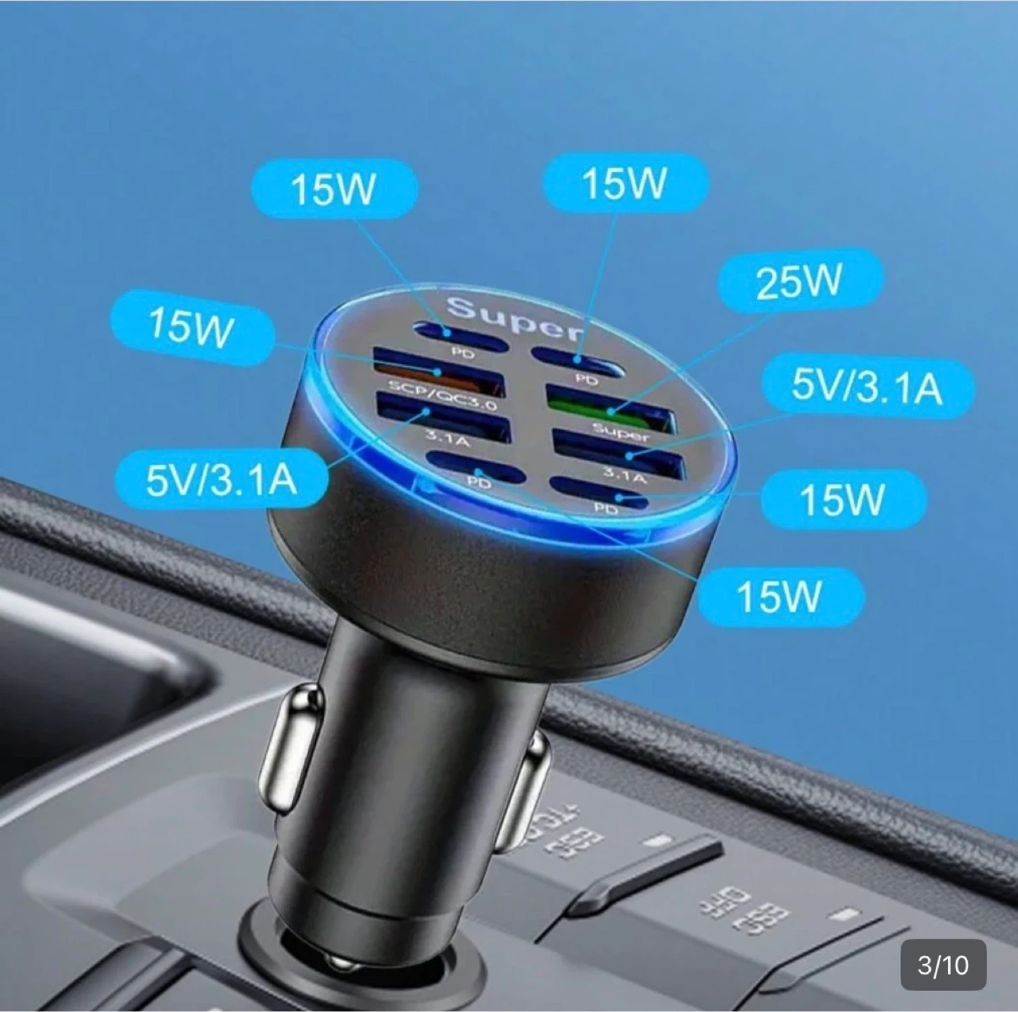 Multi port car charger for cigarette lighter style charging port.