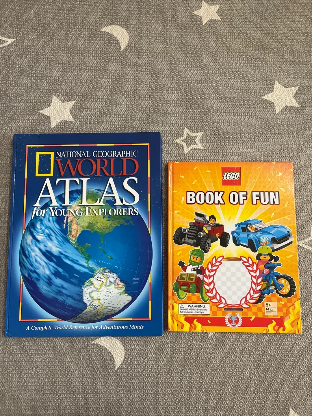 This bundle includes the National Geographic World Atlas for Young Explorers and the Lego Book of Fun. The Lego book is for ages 5+ and contains 14 pieces. A warning for small parts not for children under 3 yrs is present on the Lego book.
