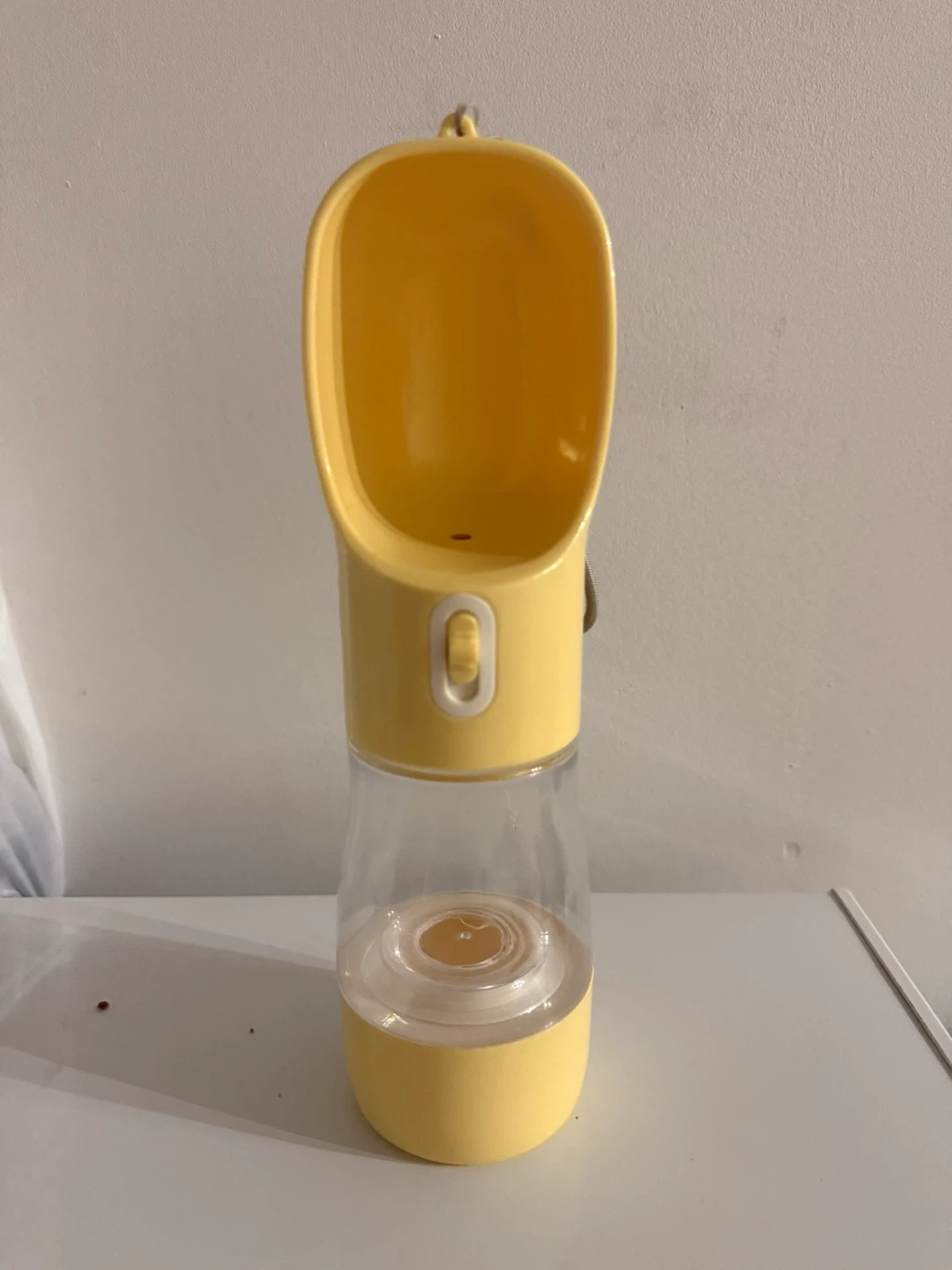 This is a yellow portable water bottle for pets. It's made of plastic and has a clear water reservoir. A button on the side controls the water flow into the attached trough.