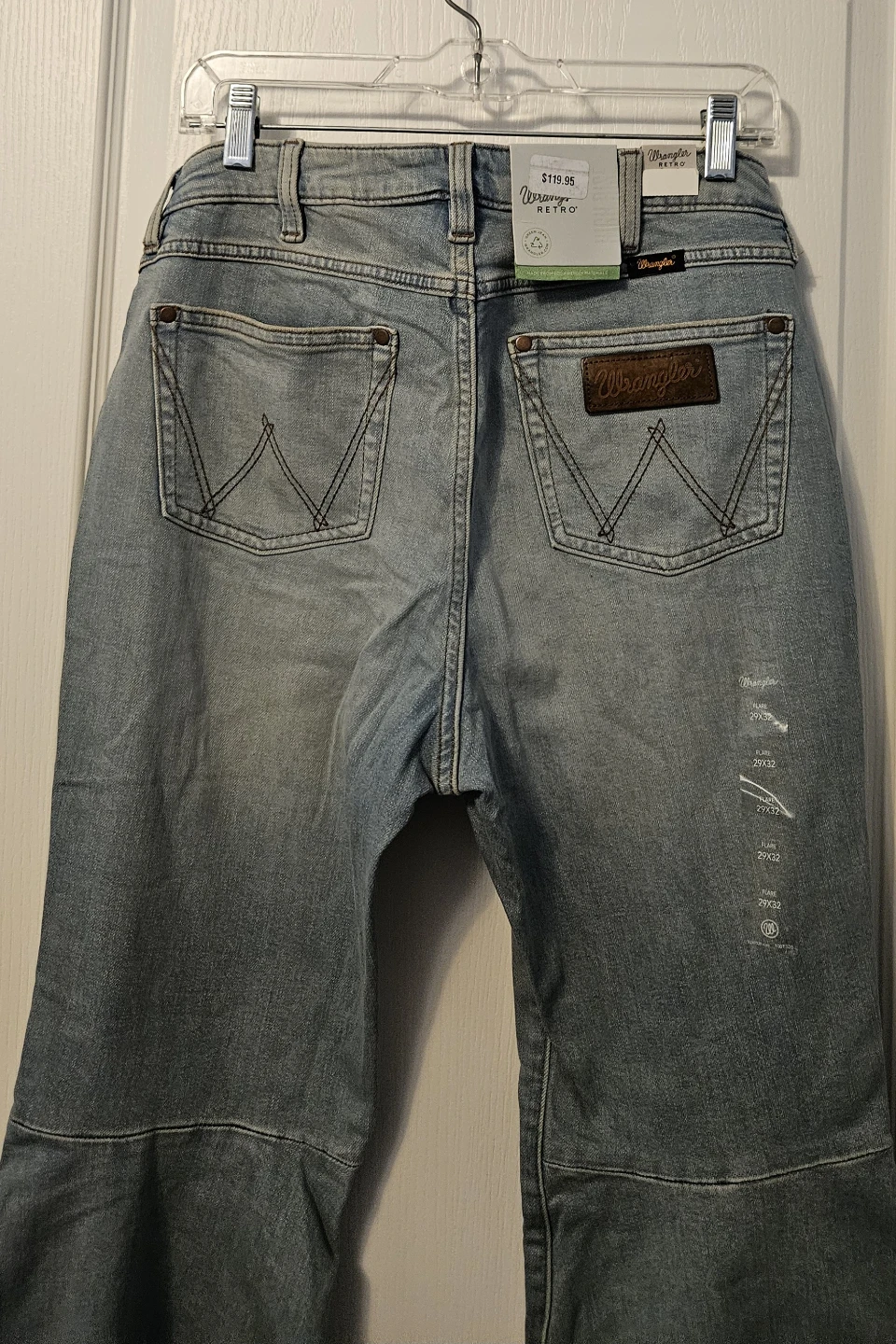 These light wash Wrangler Retro jeans are a women's size 29x32. They feature a flare leg style. Denim material.