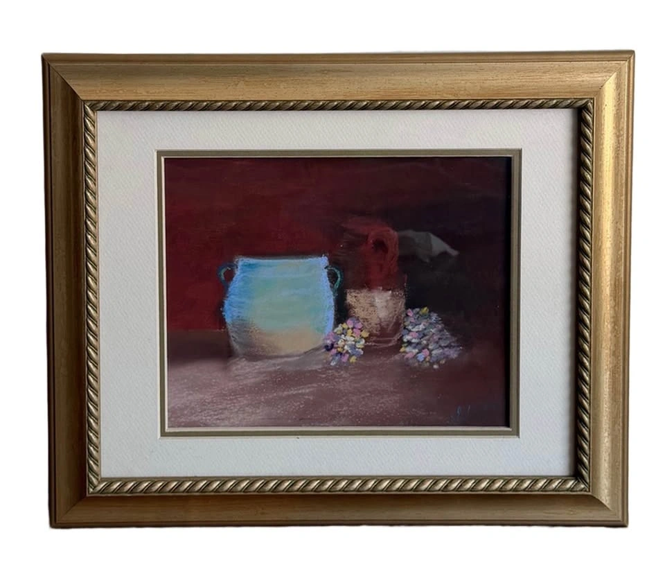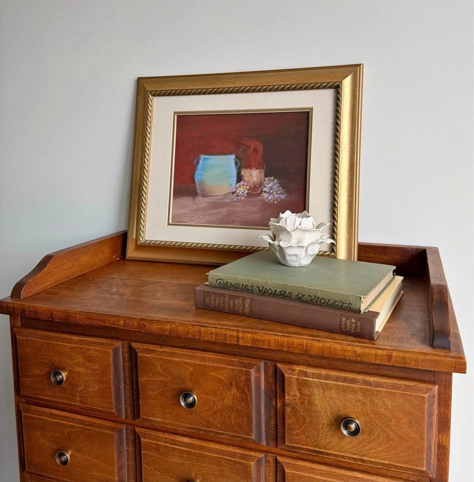 Beautiful framed, signed still life artwork featuring warm, rich tones and a classic composition. This piece is set in an elegant vintage-style gold frame with detailed edging and a neutral mat, making it easy to incorporate into a variety of interiors—from traditional to modern classic. 16.5 x 14 inches. Timeless still life subject (ceramic vessels + florals). Substantial gold frame with decorative detail. Neutral matting for a refined, gallery-style look. Ready to hang or display leaning. Excellent condition. Perfect for entryway or hallway styling, bedroom or living room decor, layering on a dresser or console, adding warmth and character to a space. A versatile, designer-style piece that elevates a room without overpowering it. Pickup in Keswick or Newmarket. Delivery available depending on location.