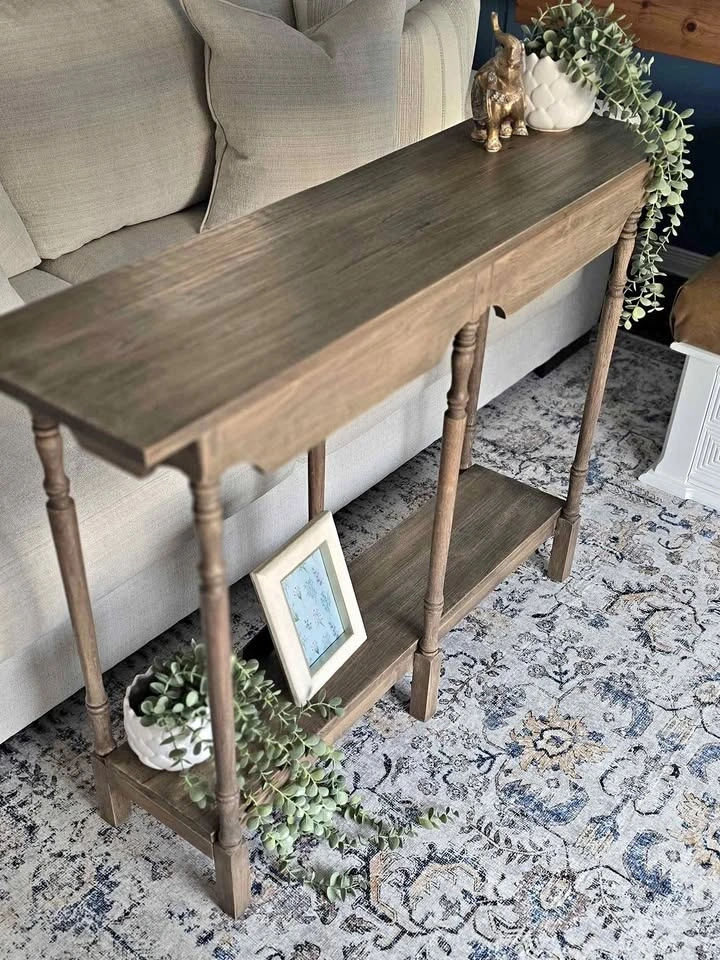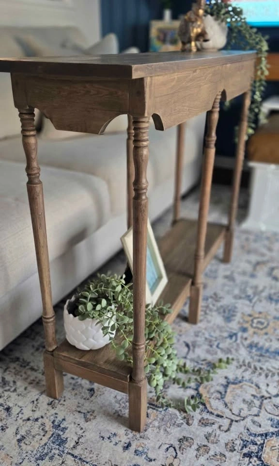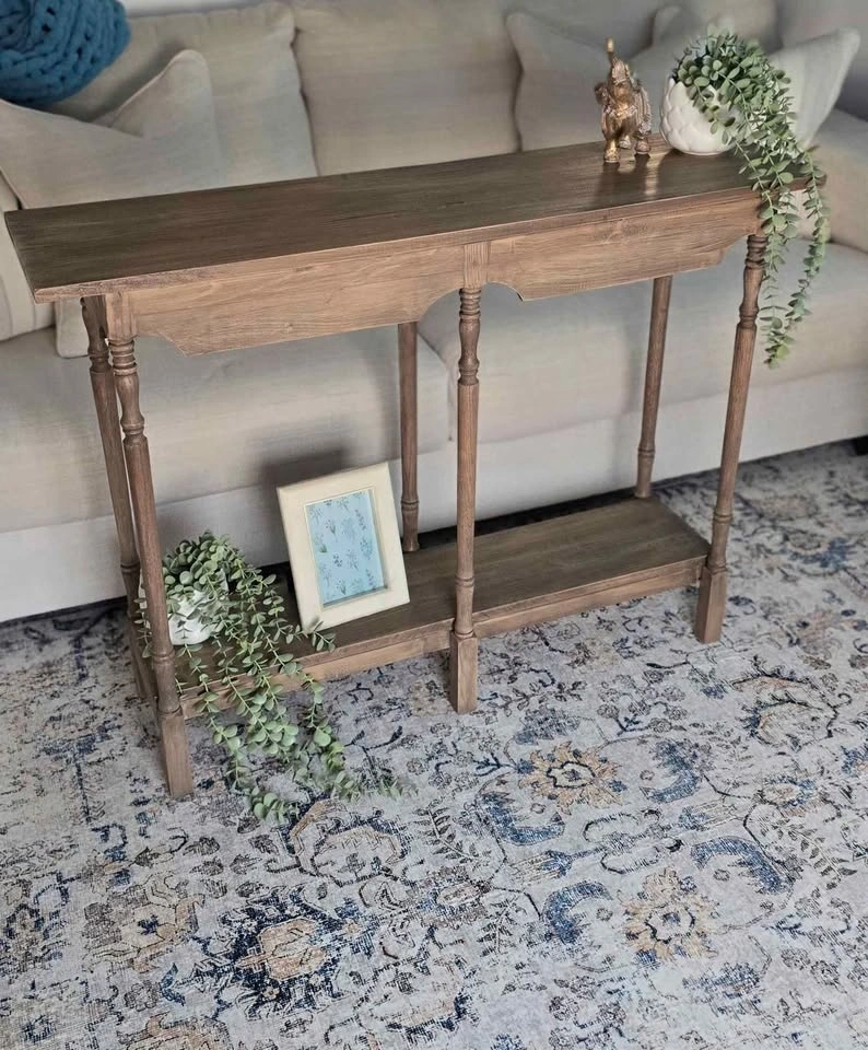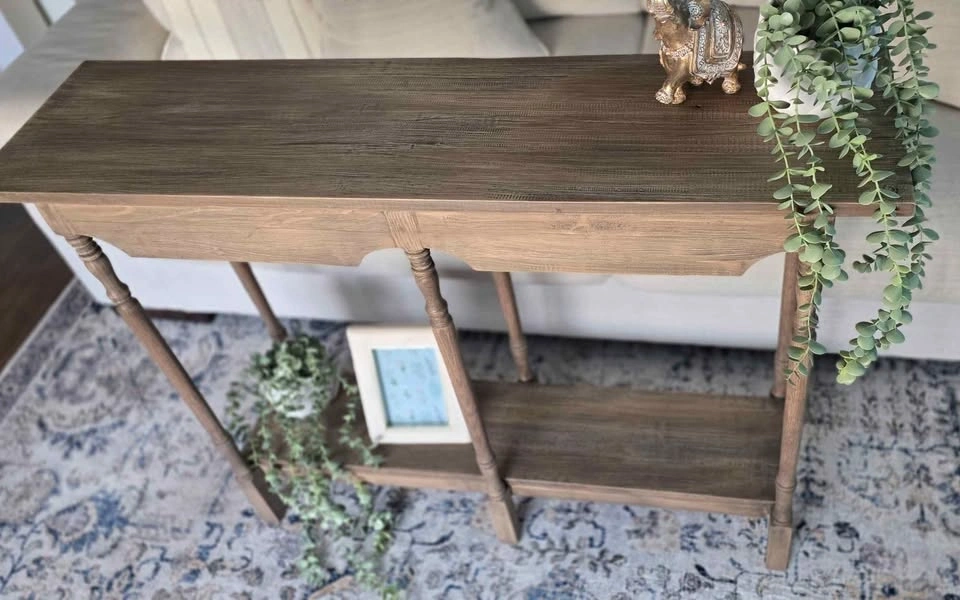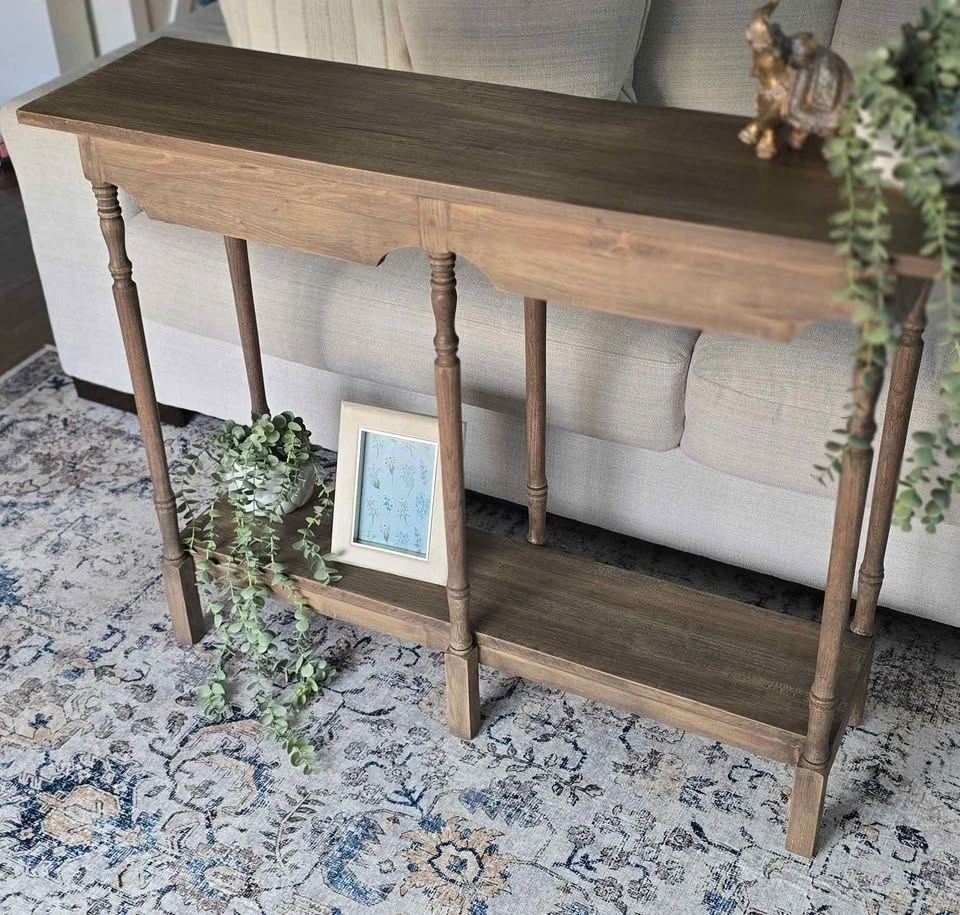 Beautiful piece made with repurposed oak stair spindles and pine wood with a nice texture. It was white washed and then finished with a briarsmoke stain for a lovely contrast. Dimensions are 43 inches long, 11 1/4 inches deep, and 32 inches high.