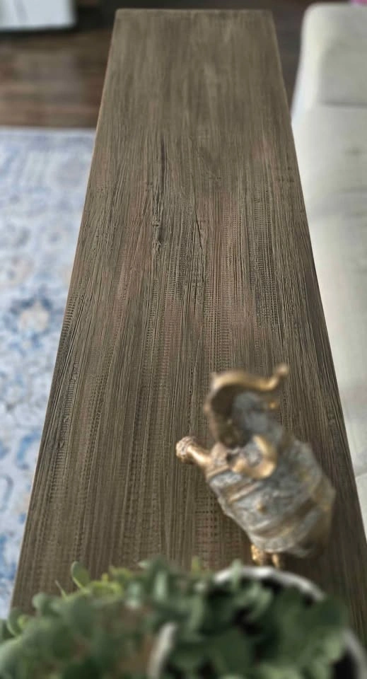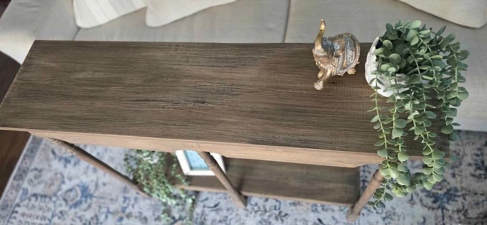 Beautiful piece made with repurposed oak stair spindles and pine wood with a nice texture. It was white washed and then finished with a briarsmoke stain for a lovely contrast. Dimensions are 43 inches long, 11 1/4 inches deep, and 32 inches high.