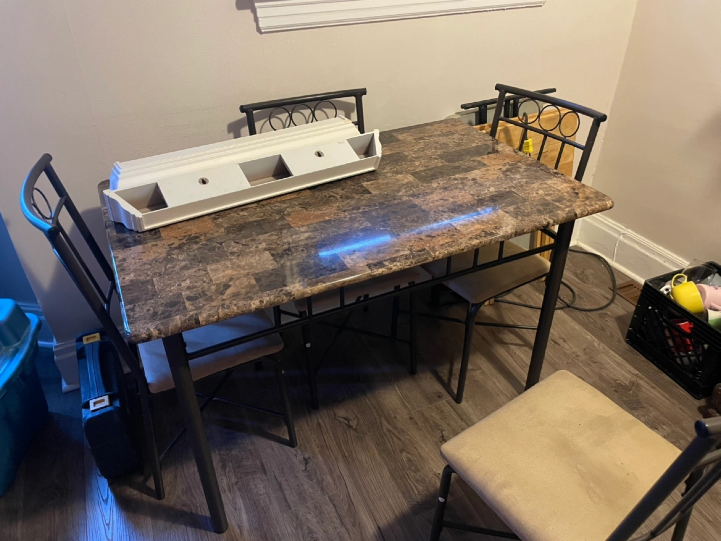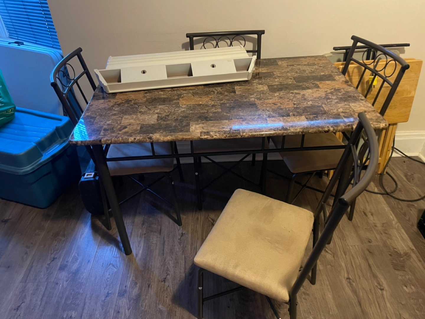 Small kitchen table set. Marble-look table top. Black metal frame. Four beige fabric chairs. Minor wear and tear. Still in great condition