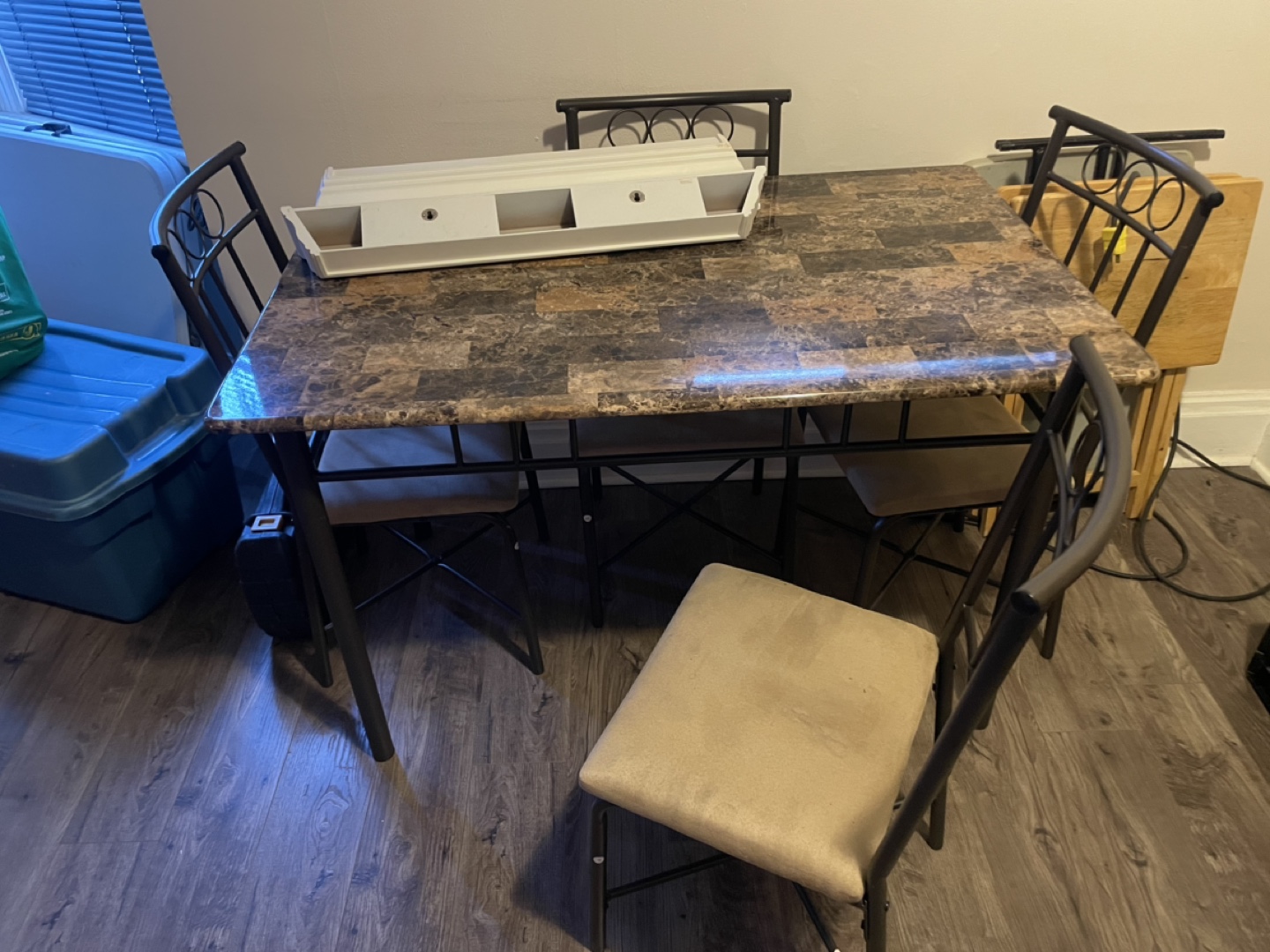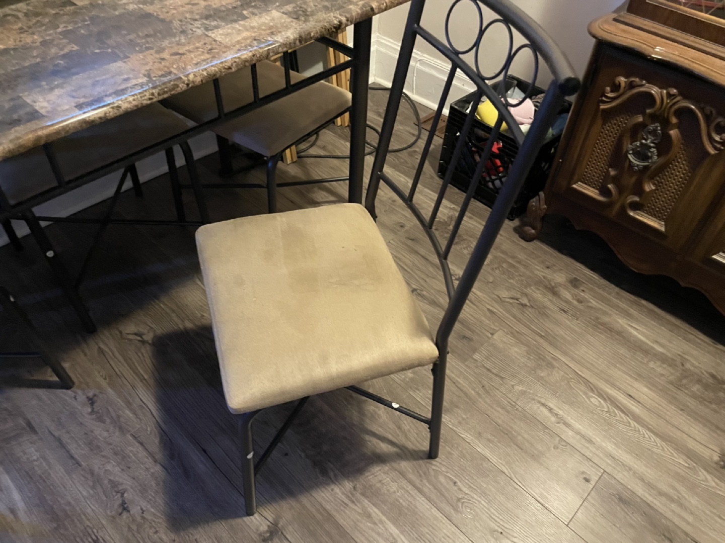 Small kitchen table set. Marble-look table top. Black metal frame. Four beige fabric chairs. Minor wear and tear. Still in great condition