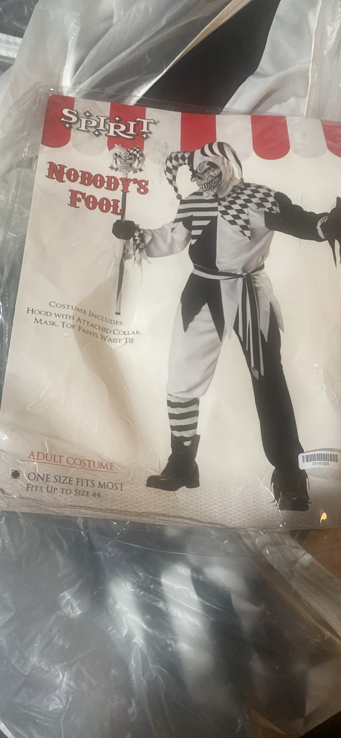 Spirit Halloween costume, Nobody's Fool design. It's an adult costume that fits up to size 44. Costume includes hood with attached collar, mask, top, pants, and waist tie.