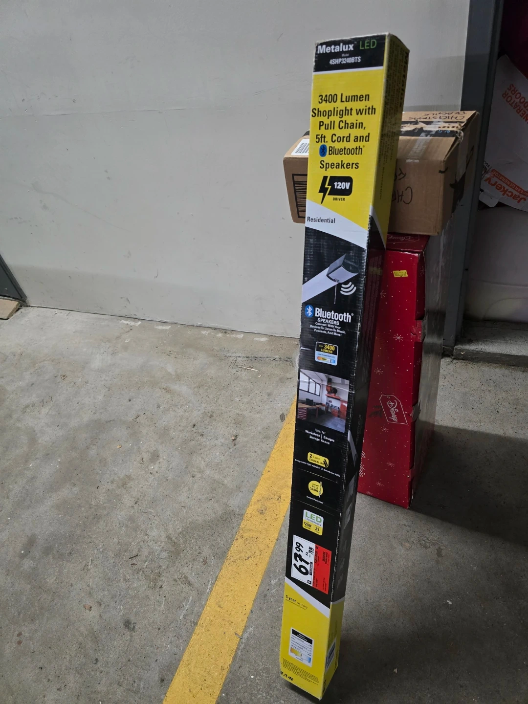 Selling a Metalux LED shoplight with Bluetooth speakers! It has a pull chain and a 5ft cord. It outputs 3400 lumens and is designed for residential use