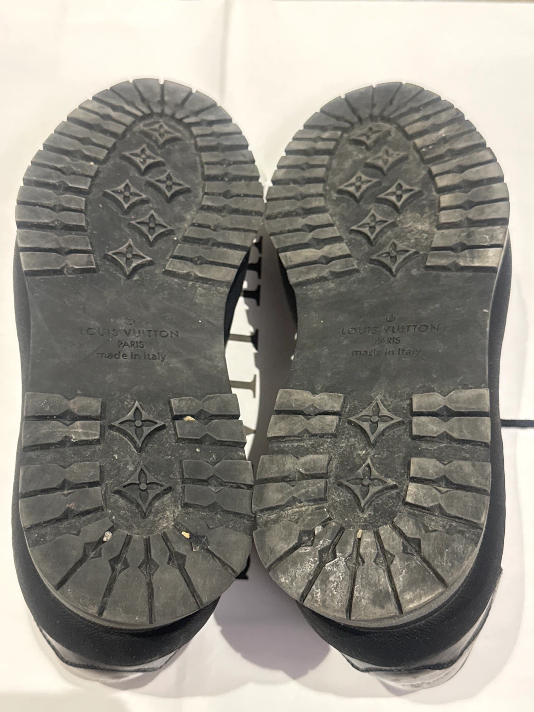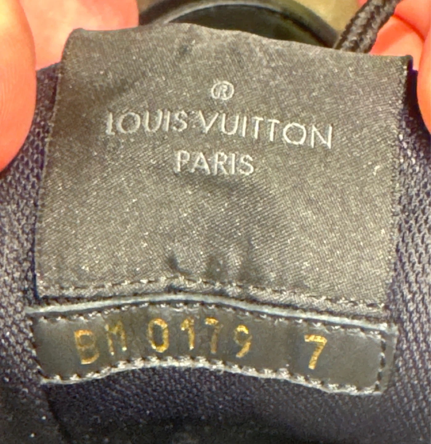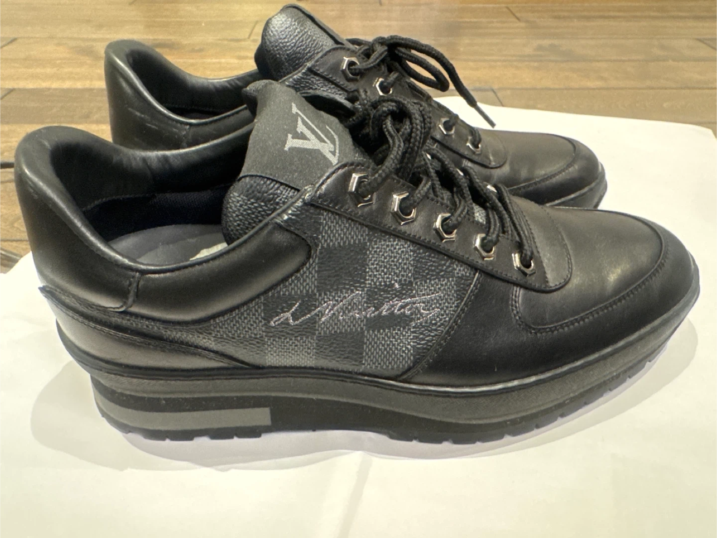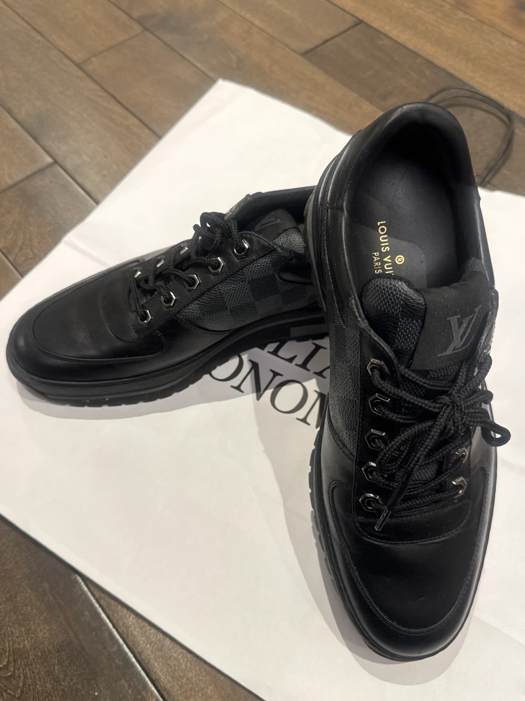 Authentic Louis Vuitton Paris sneakers crafted from black leather. These stylish shoes feature the iconic LV monogram and checkered pattern. Men Size 7.