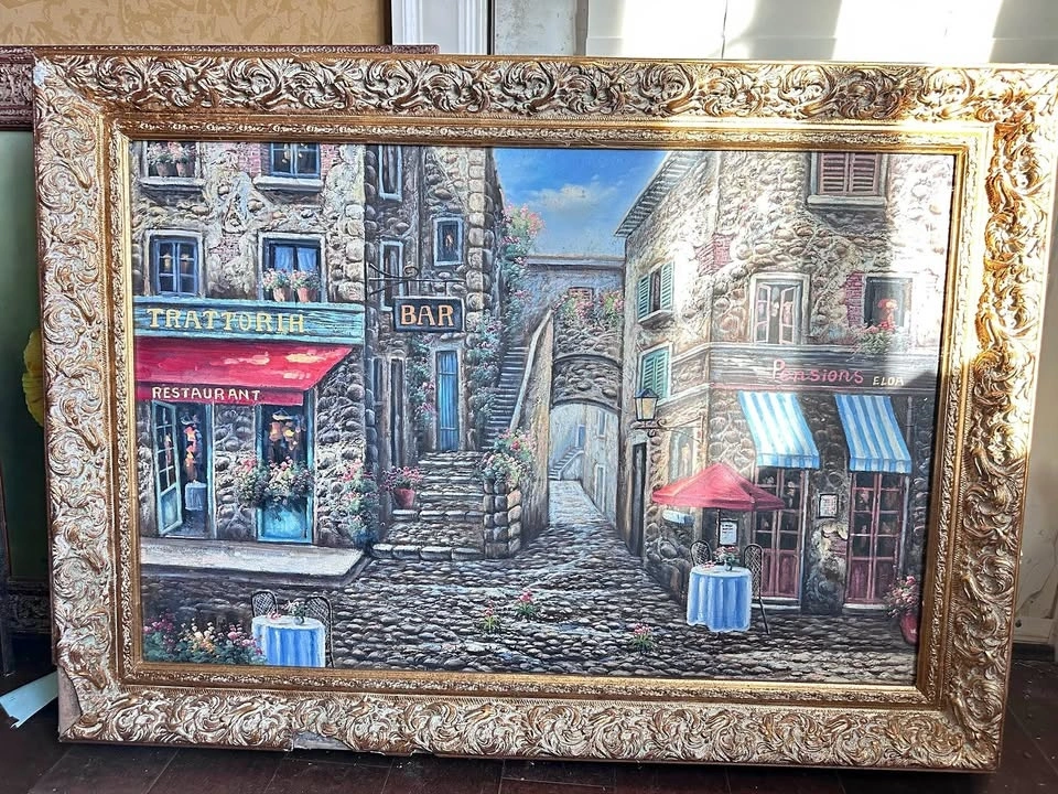 This vibrant painting depicts a charming cobblestone street lined with rustic stone buildings, colorful storefronts, and flower-filled balconies, capturing the warmth of a classic European village. Rich details and an ornate gold frame enhance its inviting, old-world atmosphere, making it a standout decorative piece for any space.