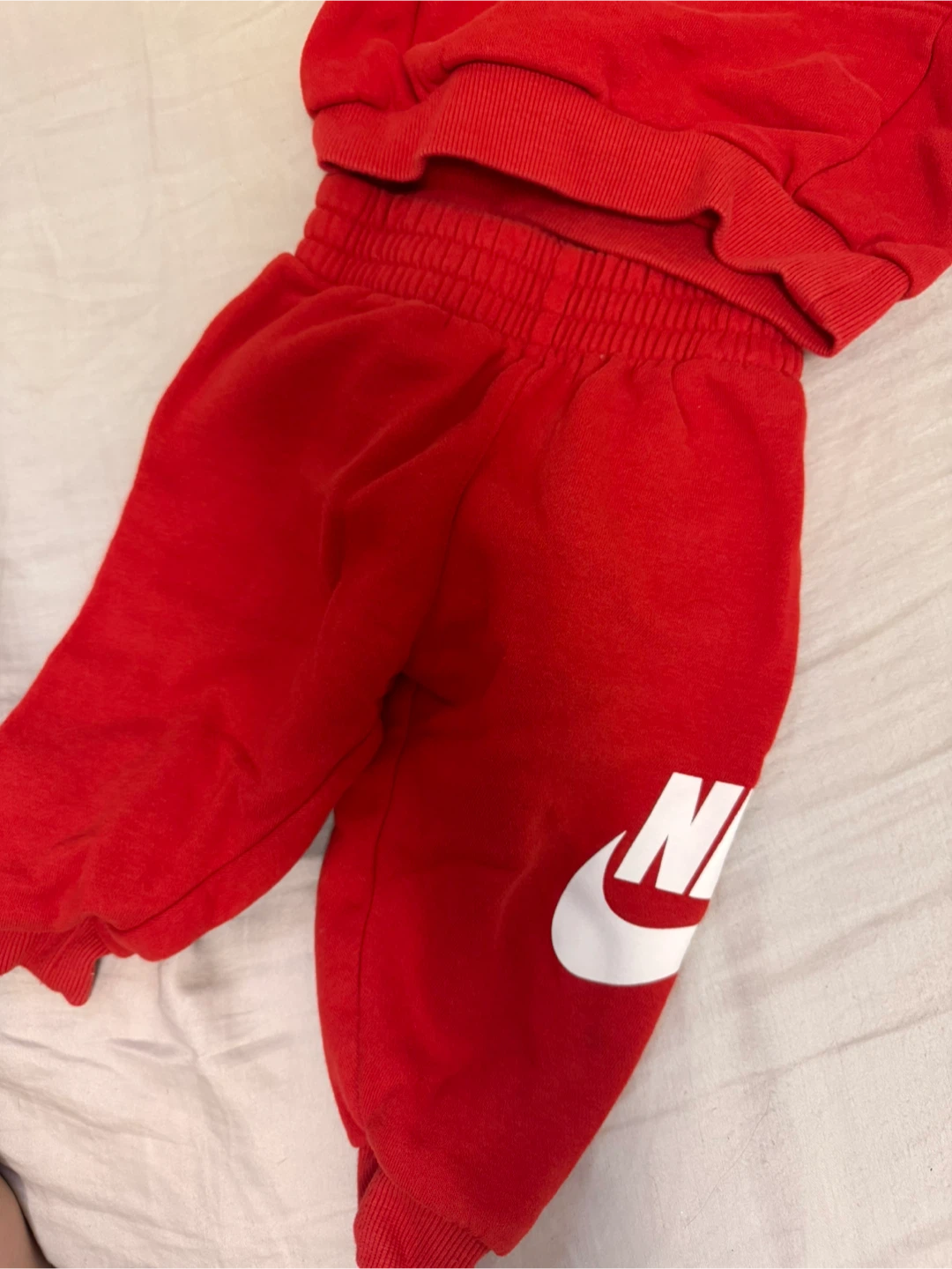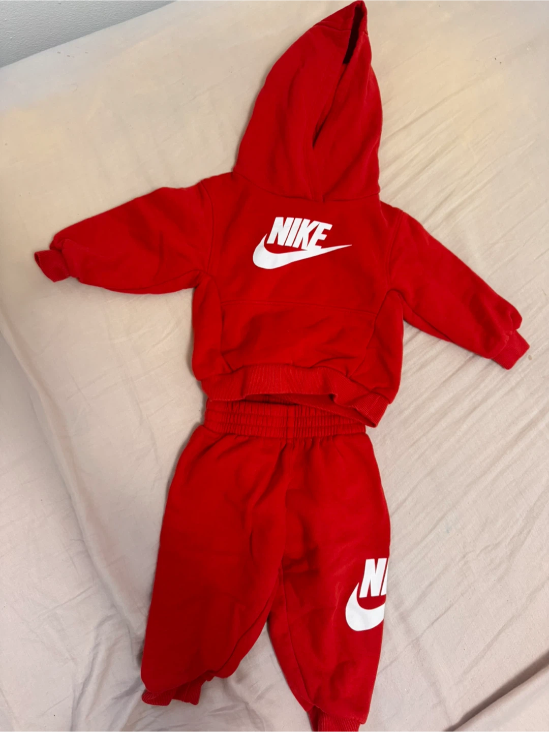 Selling a super cute Nike tracksuit for babies or toddlers! It's a vibrant red colour with the Nike logo on both the hoodie and the pants. Perfect for keeping your little one comfy and stylish
