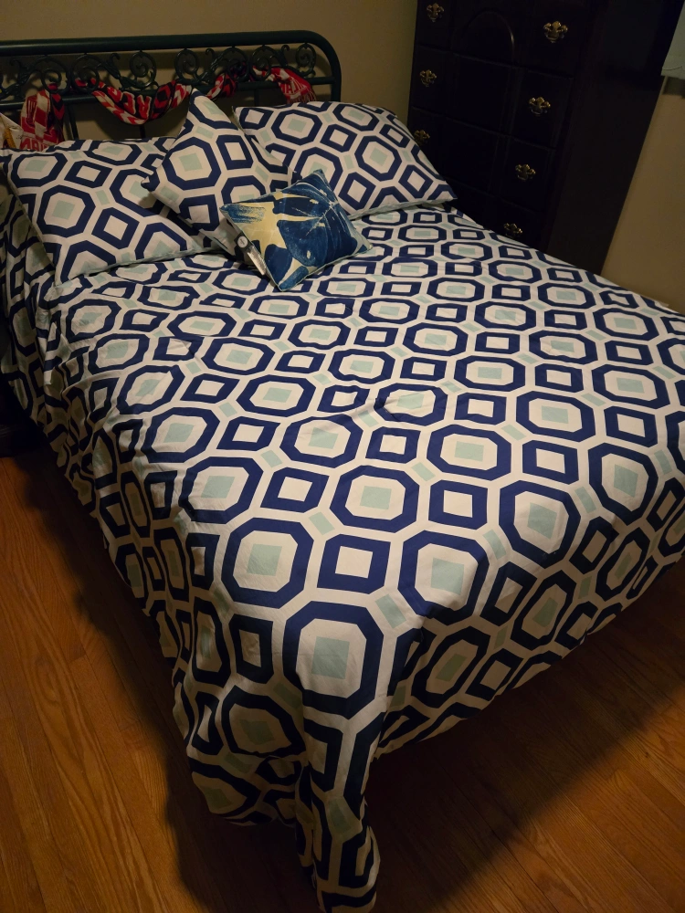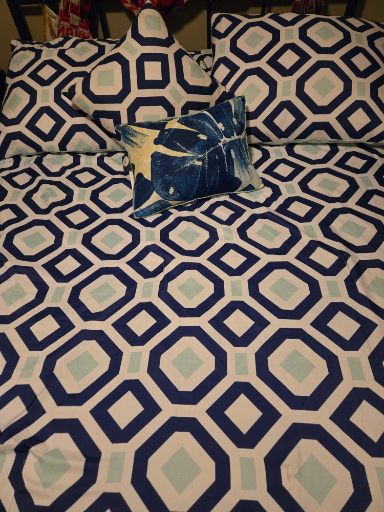 5 piece Double/Queen comforter set in excelkent condition; featuring a geometric pattern in blue, white, and light blue. Includes two zippered pillow shams, a zippered square and a rectangular decorative pillow. Comes in original bag. Willing to meet at a convenient location in Etobicoke.