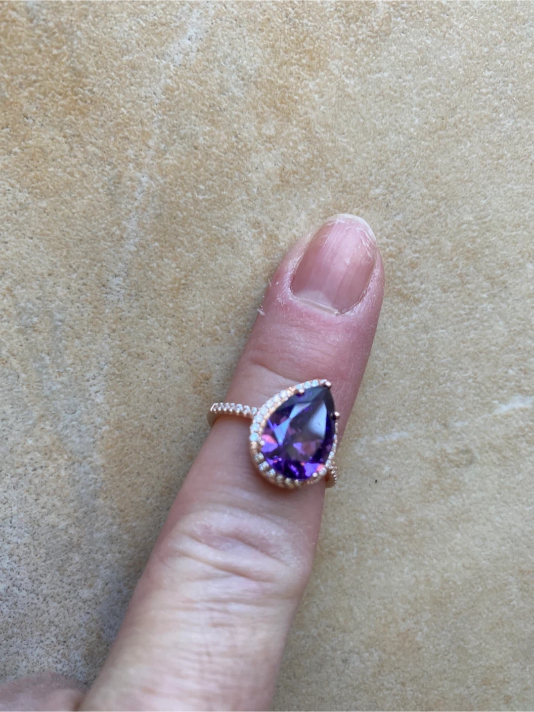 This ring features a pear-shaped amethyst stone, set in a rose gold tone band. The stone is surrounded by smaller clear stones. It comes with a red velvet ring box. Great for gifting.