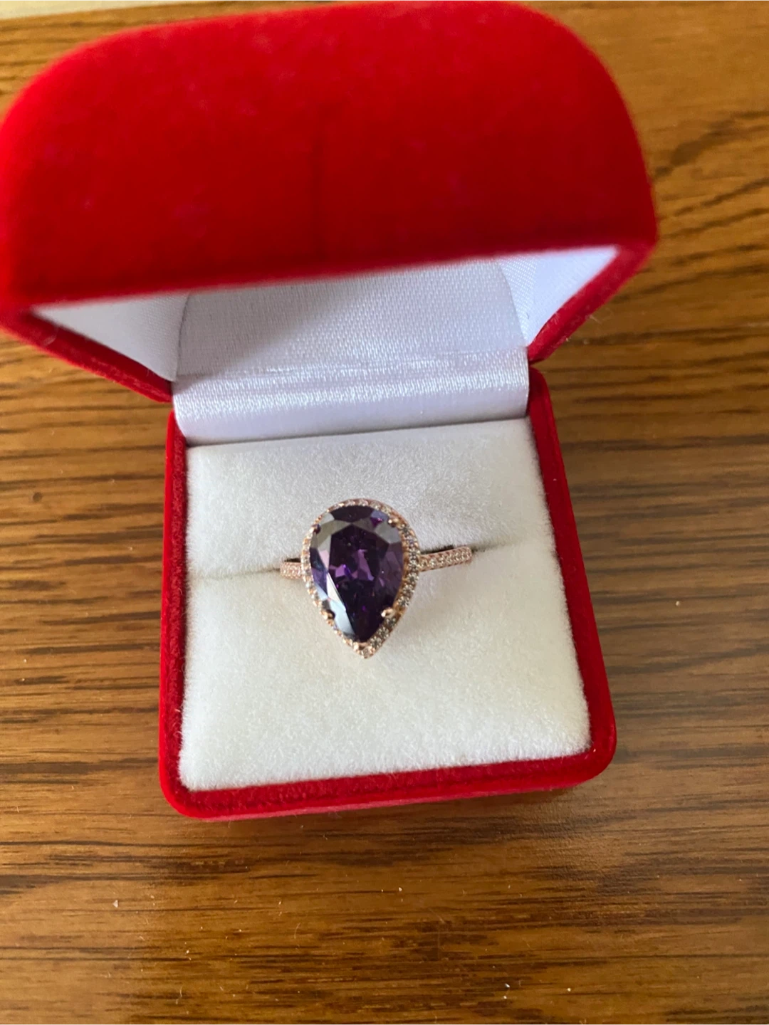 This ring features a pear-shaped amethyst stone, set in a rose gold tone band. The stone is surrounded by smaller clear stones. It comes with a red velvet ring box. Great for gifting.