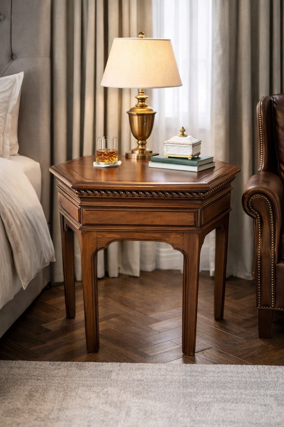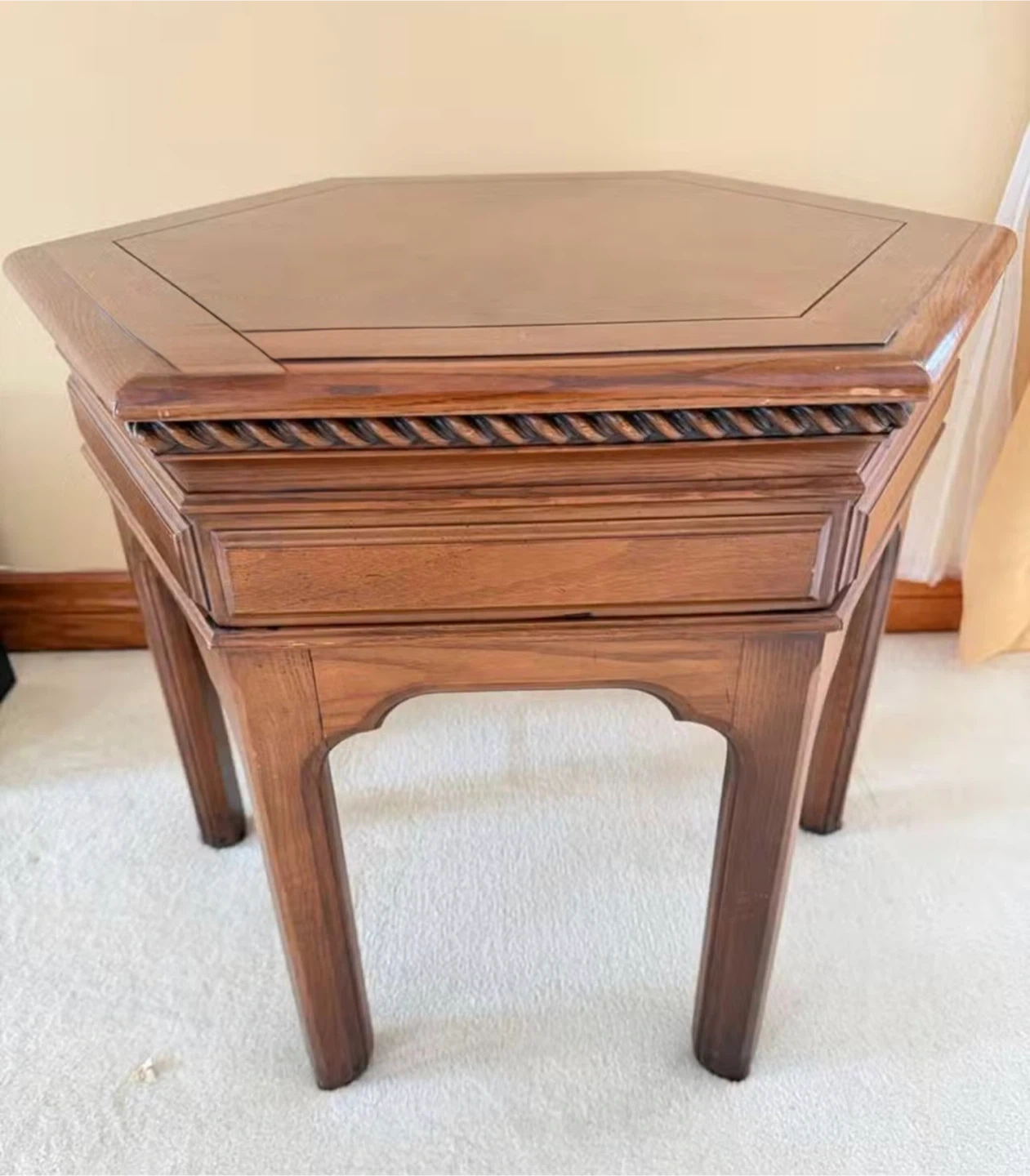 A handsome wooden hexagonal accent table. It features a carved rope detail and a single drawer for storage. This table's design would suit a living room or bedroom.