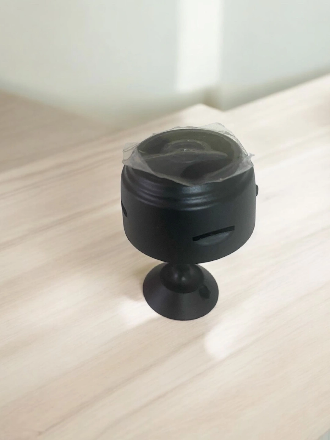 161Small black security camera. Wireless. Includes a small base for mounting.