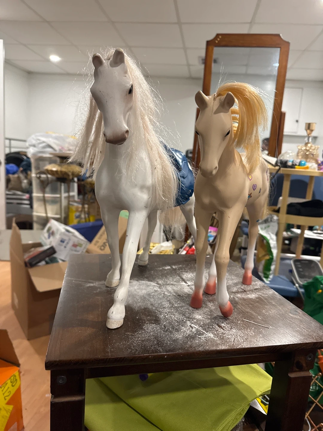 Two toy horses for sale! One is white with a blue saddle and the other is tan with decorations on its side. They're in good condition and ready for a new home Pick up Scarborough golf club rd n Lawrence Just wipe em