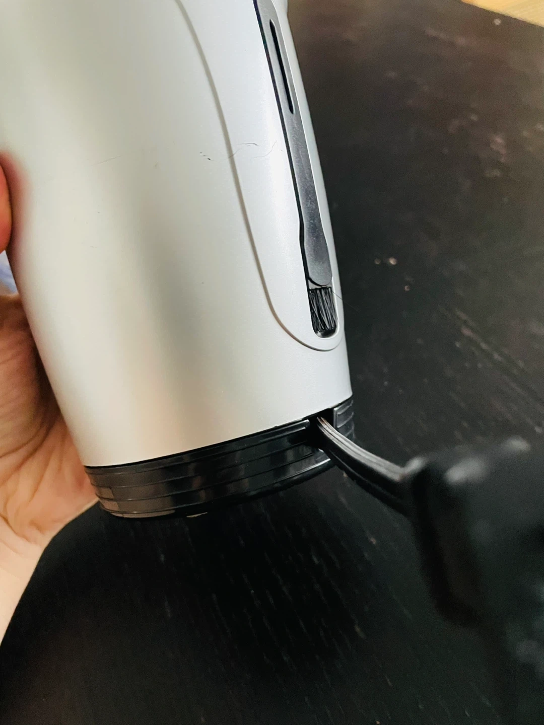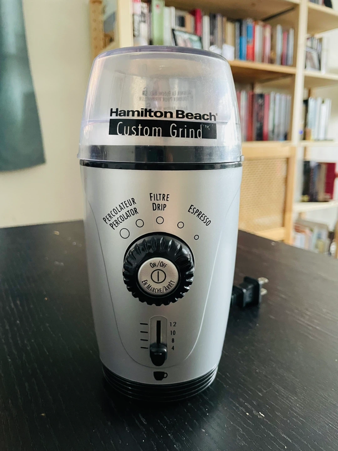 Hamilton Beach coffee grinder. Multiple settings for different cup sizes and coffee types. Cable can be rolled and hidden at the bottom when grinder is not used. Brush (slotted in the back) for cleaning.