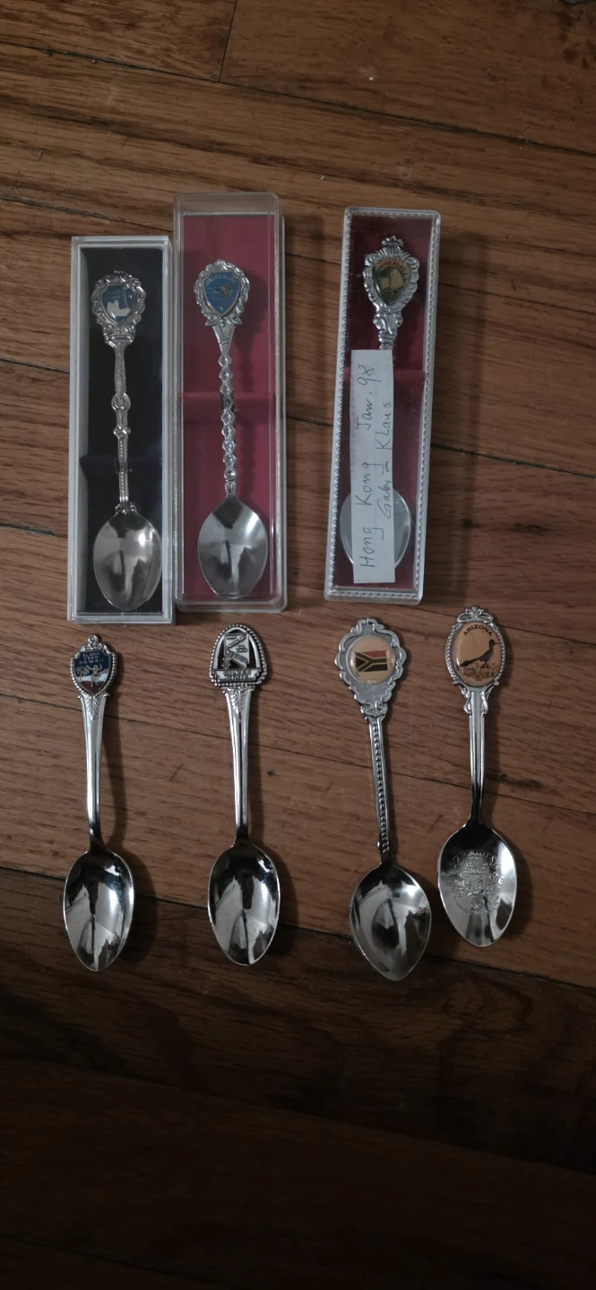 Selling a collection of vintage souvenir spoons. Some are still in their original boxes. One is from Hong Kong, dated January 1998. Others feature designs from Hawaii, Arizona, and other locations. Great for collectors!