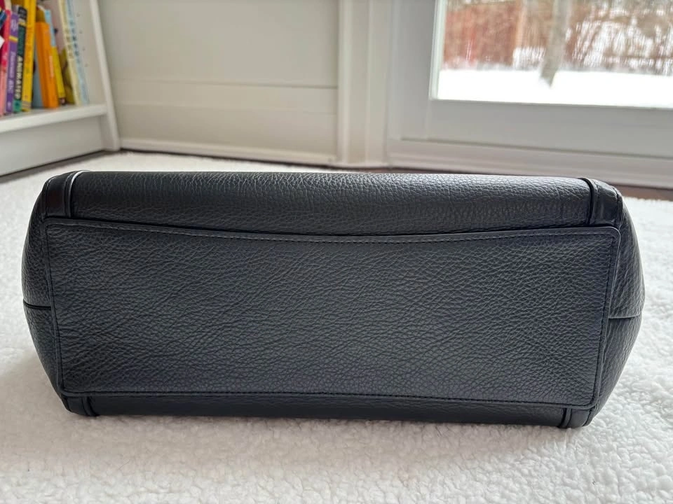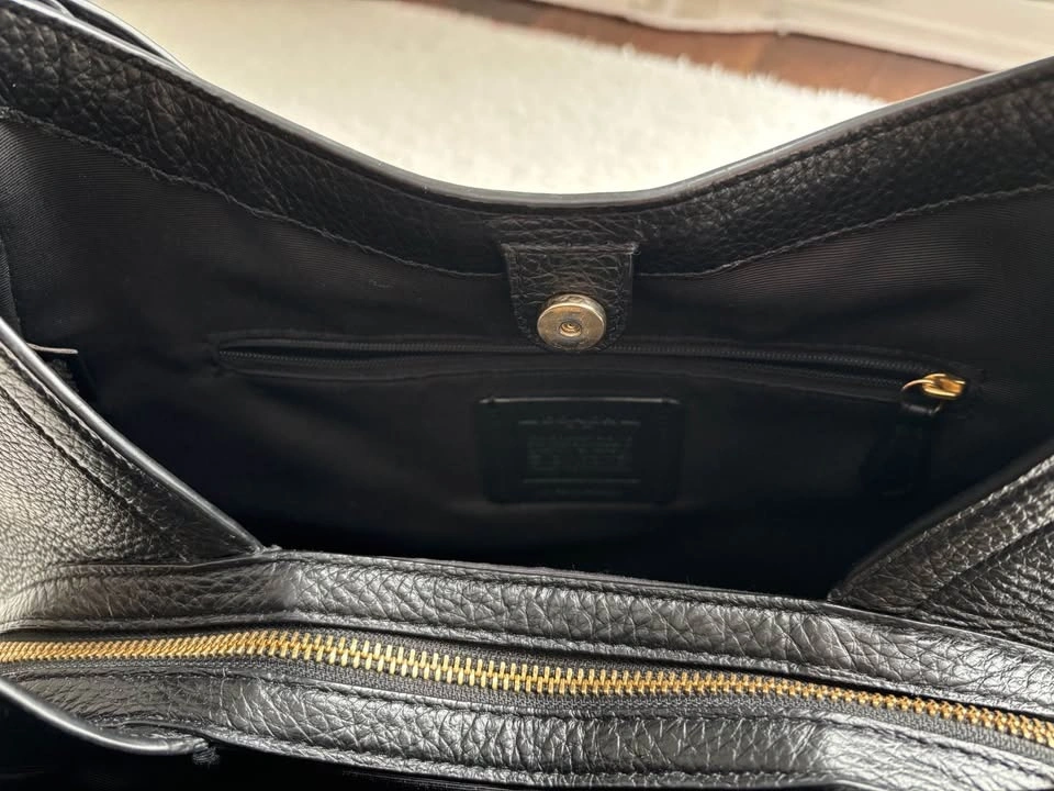 Snap Closure Coach Women's Kristy Shoulder Bag Black Smooth Leather Gold-Tone Hardware. Interior Detail: Zip Pocket, Fabric Lining, Center Zip Compartment, Cell phone, and Multifunction Pockets. Handles Drop 9 1/2". Dimention: 12 1/2" (L) x 10 3/4" (H) x 5 3/4" (W). Sold out online and in stores.