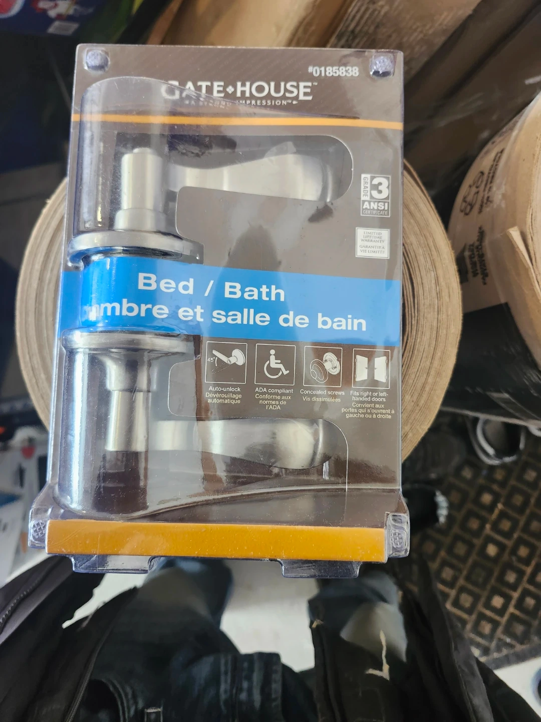 This is a Gatehouse Bed/Bath door lever with auto-unlock functionality. It's ADA compliant and fits right or left-handed doors. The lever is made of metal and comes in a brushed nickel finish.